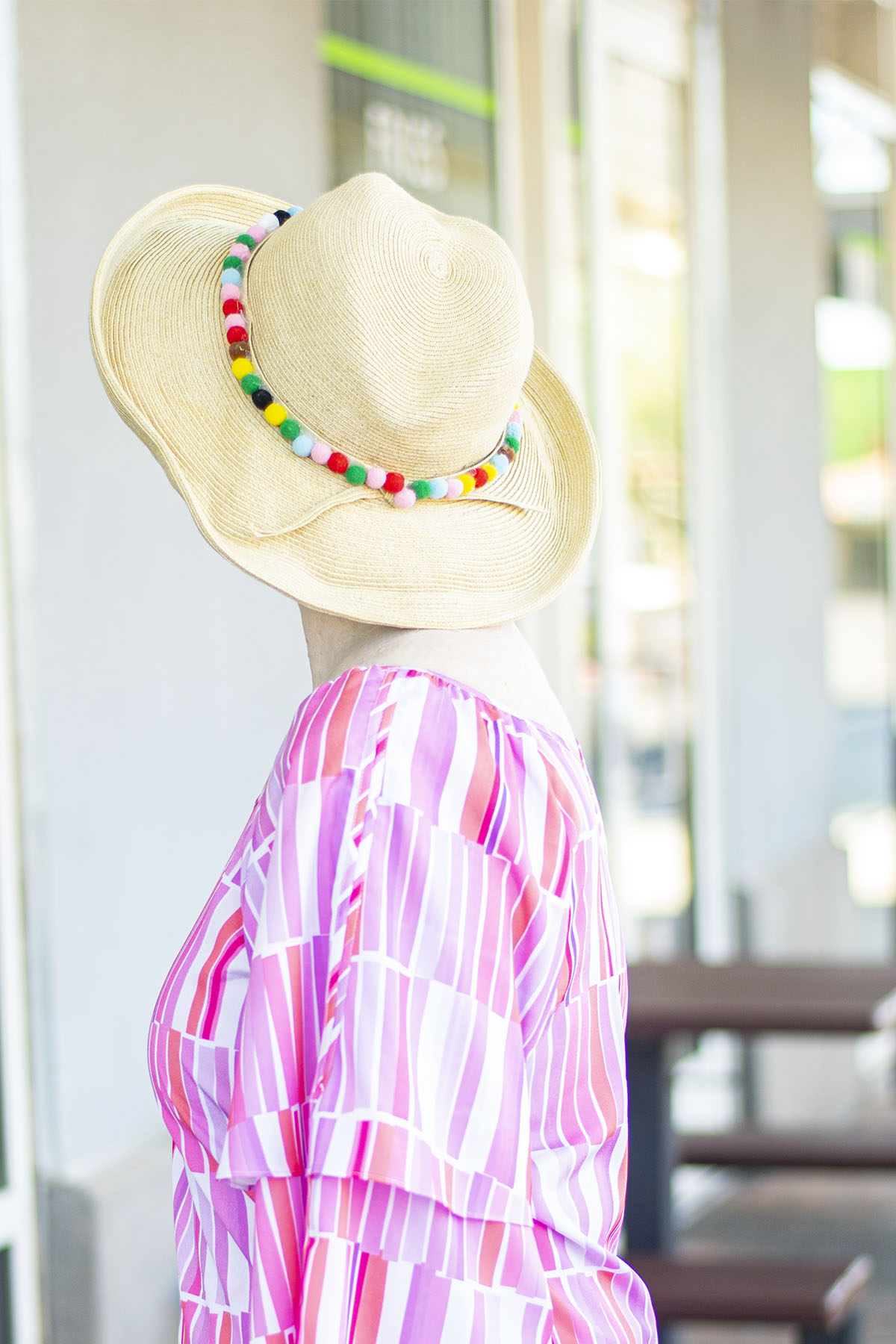 For example this straw hat. I let my mom borrow it for the day, and the pompoms were hot glued on to give it some interest.