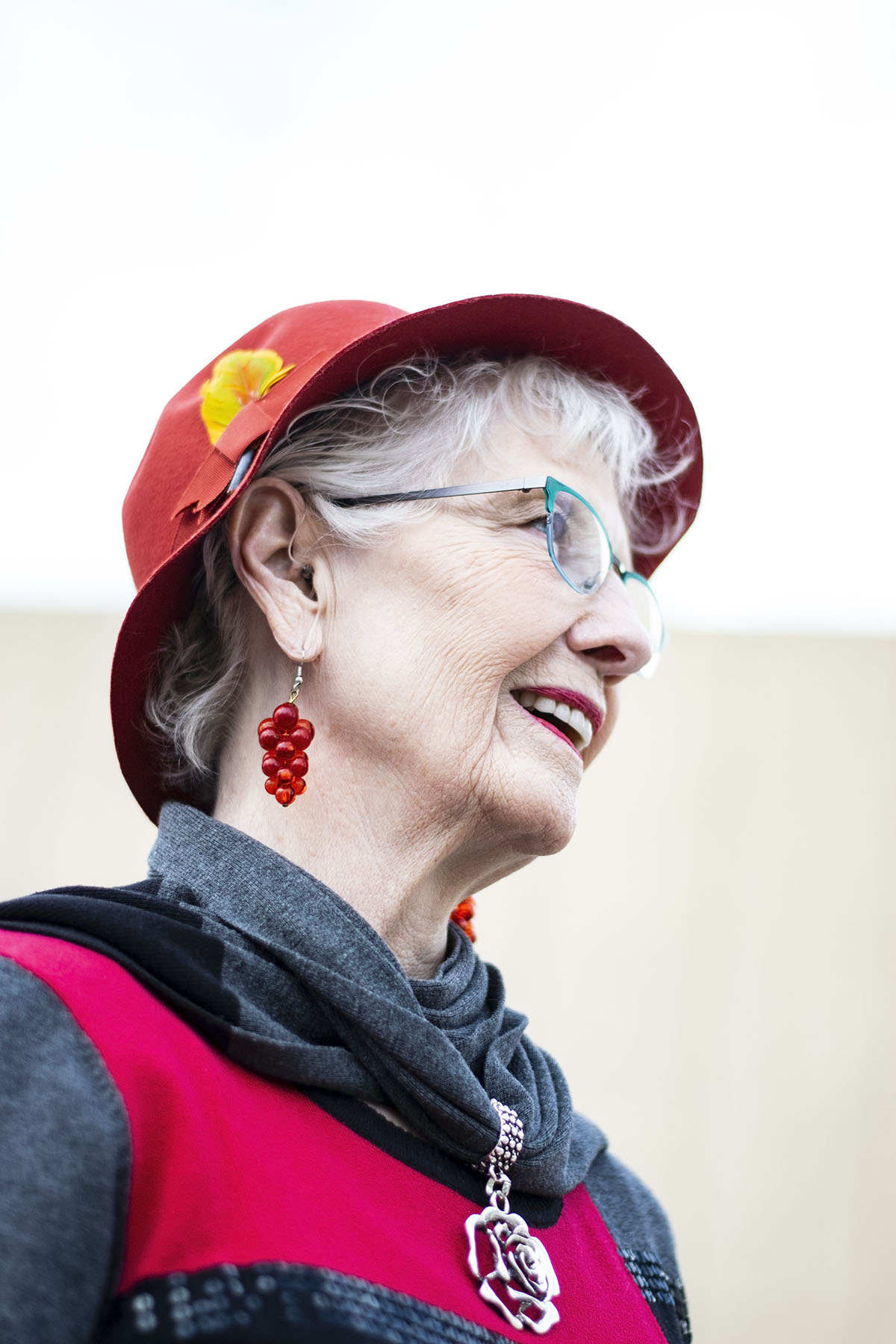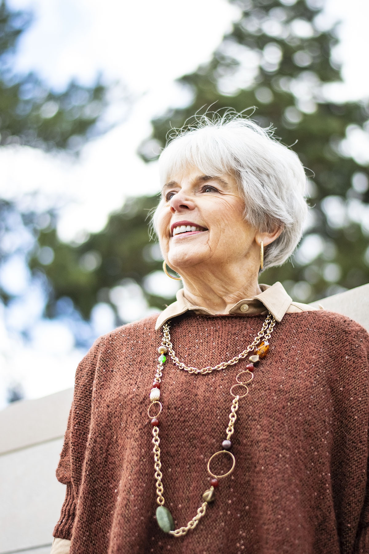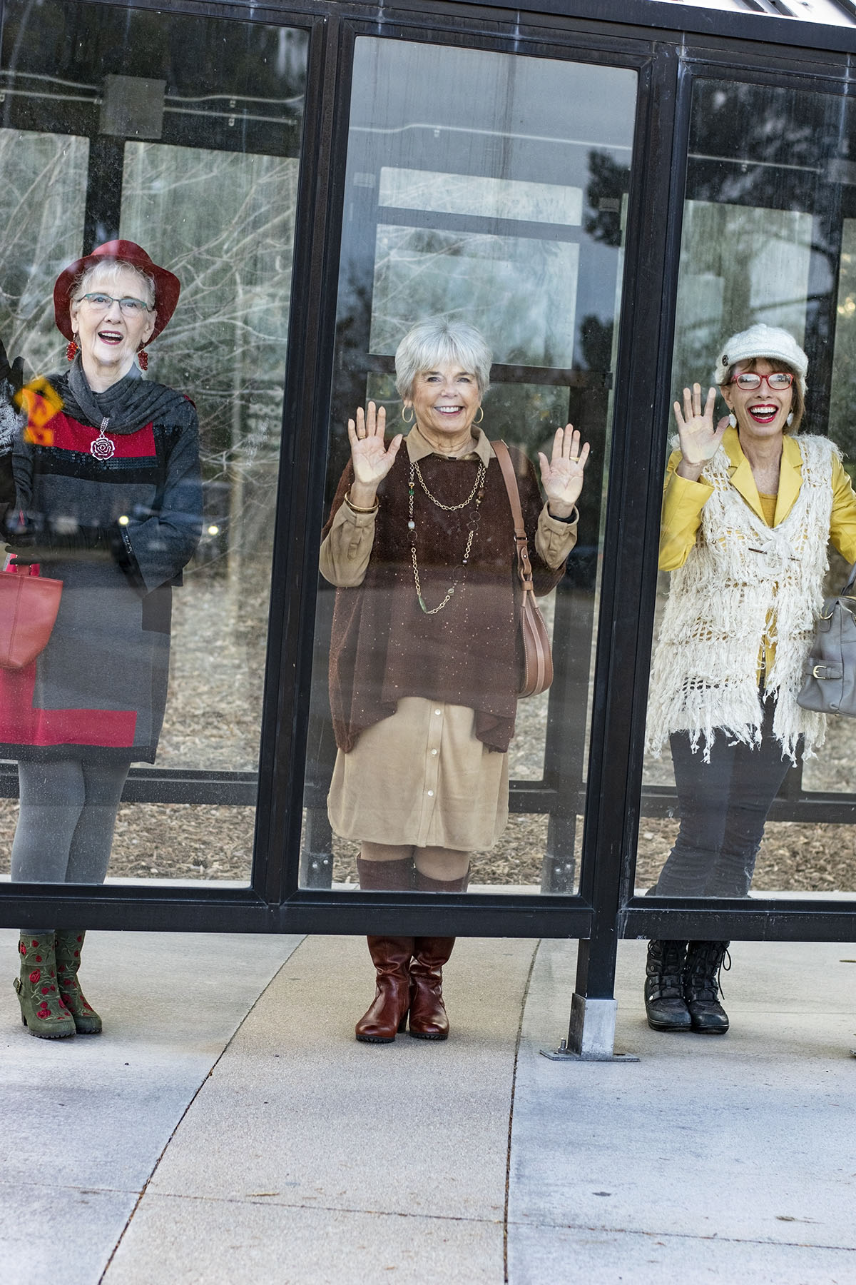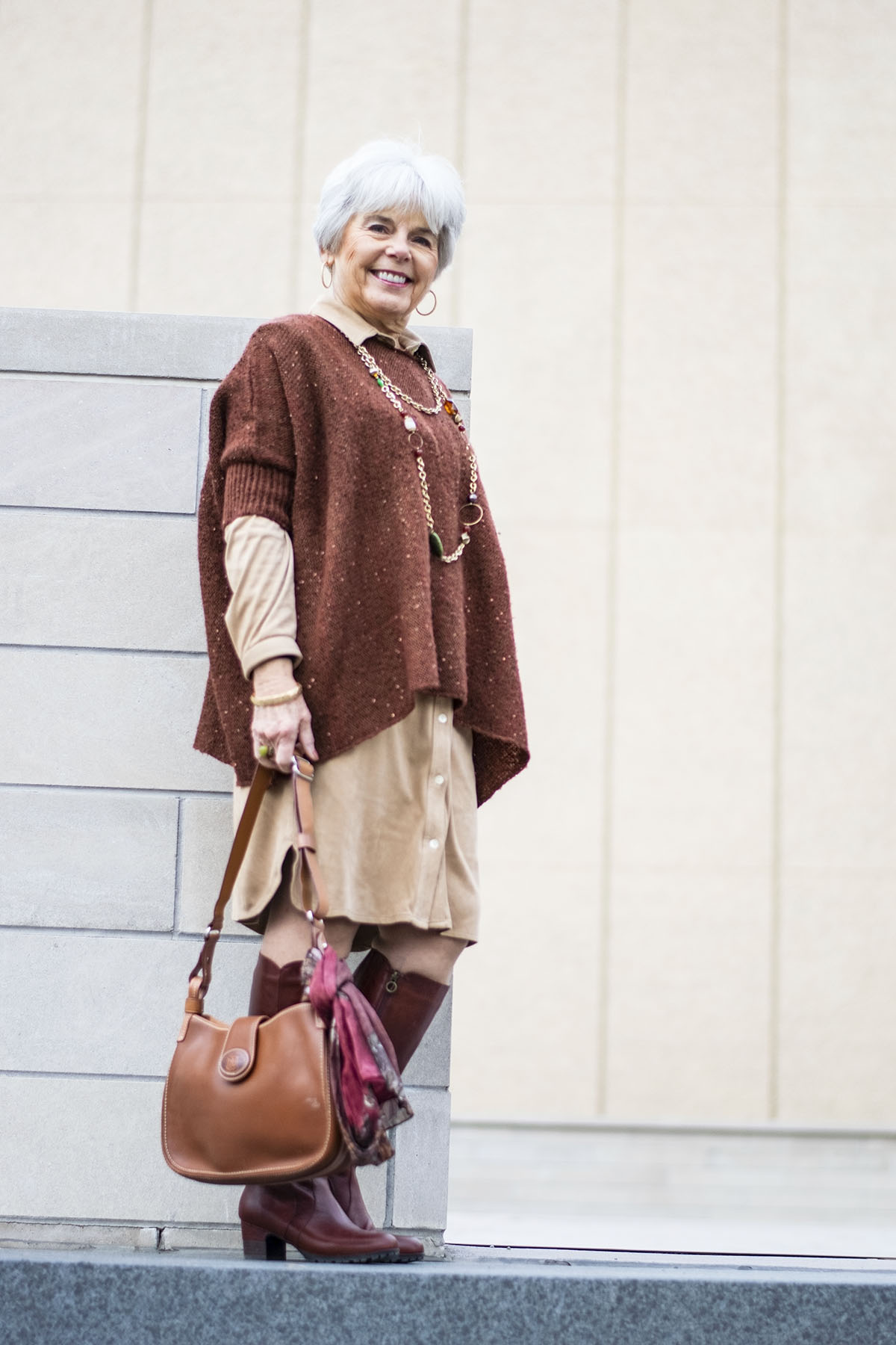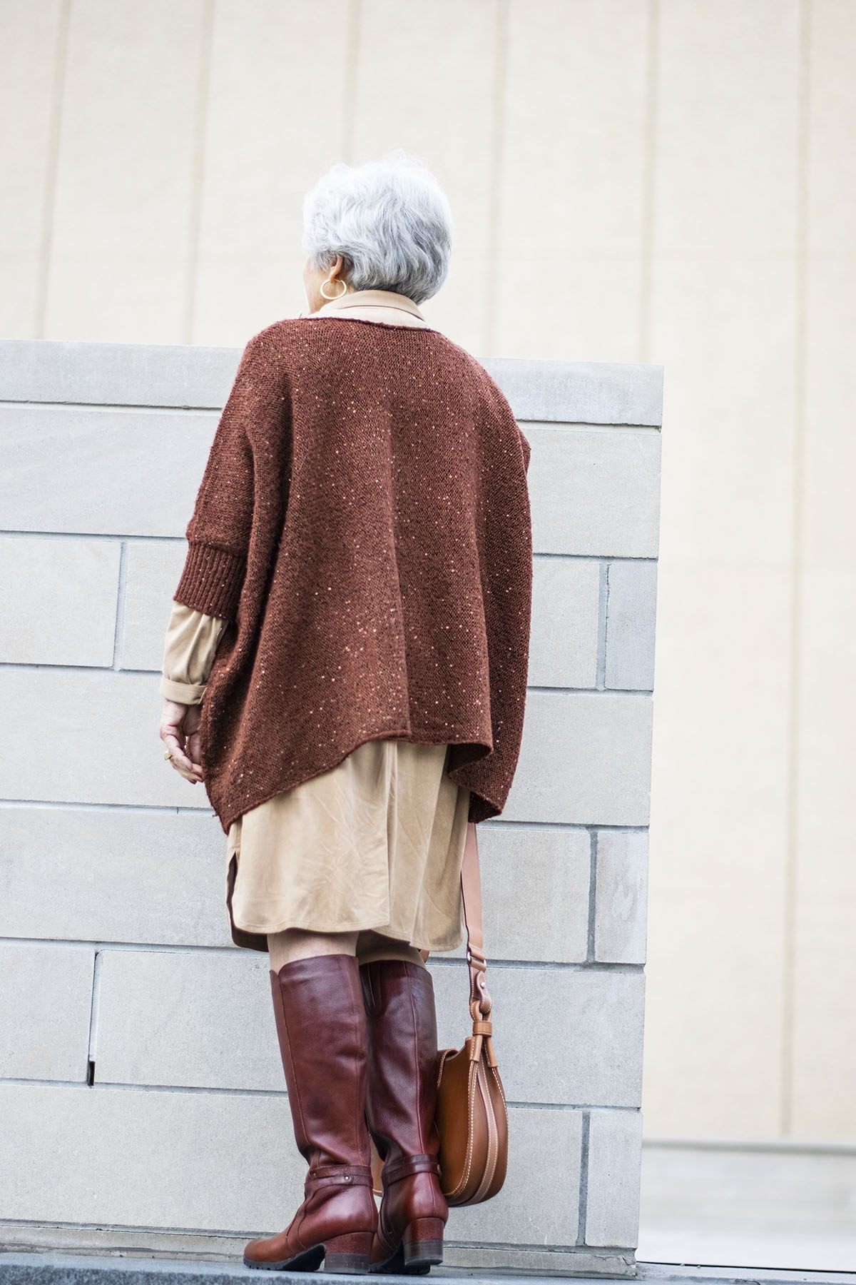 I asked Nancy to wear a dress or skirt with the boots as a different option other than skinny jeans. And so she wore her shirt dress with a brown poncho over it. This poncho is the same one in another color that she layered over her dress on our cruise.