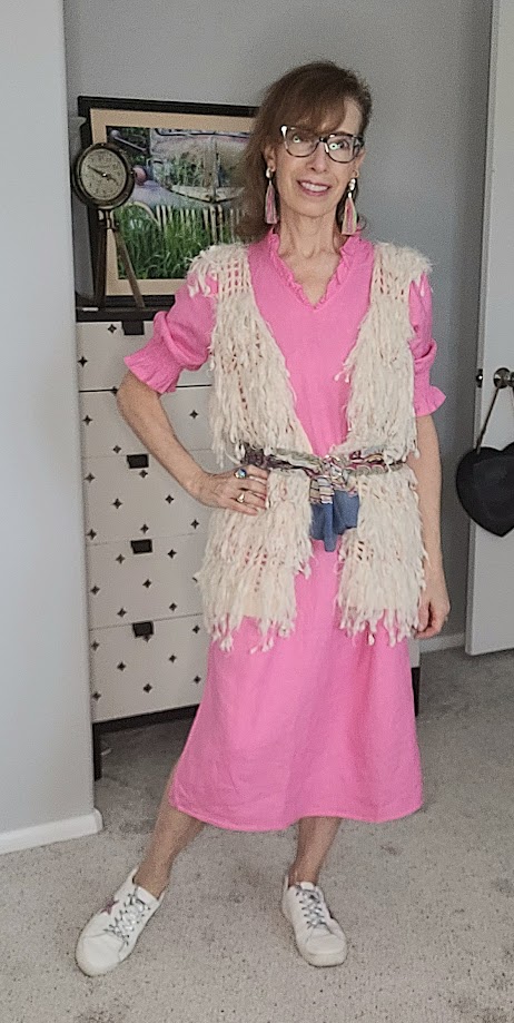 Since it’s not that hot yet, I layered a boho ivory vest over it (worn years ago in the winter OVER my yellow leather jacket).