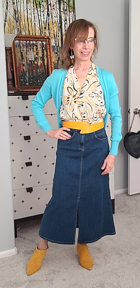 The yellow shirt is short-sleeved, so I added a turquoise cardigan that used to be my bestie’s mom’s. Notice how the cardigan acts more like a wrap. That’s because I just buttoned the last button BEHIND me. As shown in this video.