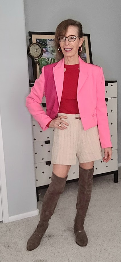 This outfit is very similar to last week’s Tuesday’s outfit. This is the time of year that I love wearing shorts and tall boots together. In fact, I really love these boots because they are slim and don’t fall down.