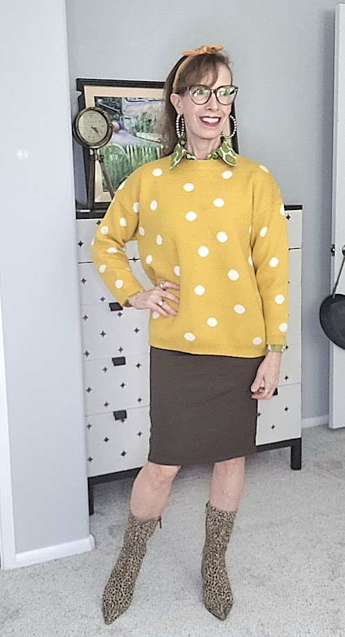 I call this my multi-polka dot look. Not only does the blouse and sweater have polka dots on it, but so does my headband. And the leopard booties could be considered polka dots too.