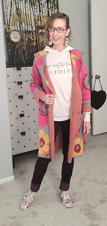 Then I wore a long sleeve, hoodie t-shirt (with my favorite saying, “Don’t act your age, Own your age.”)