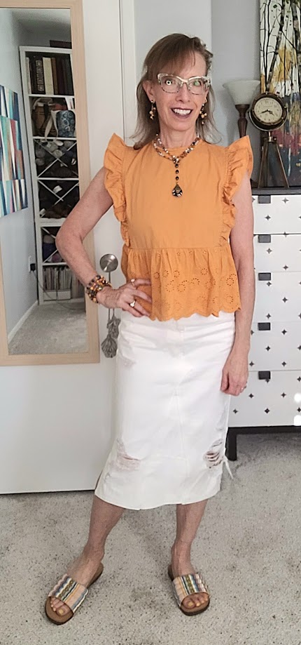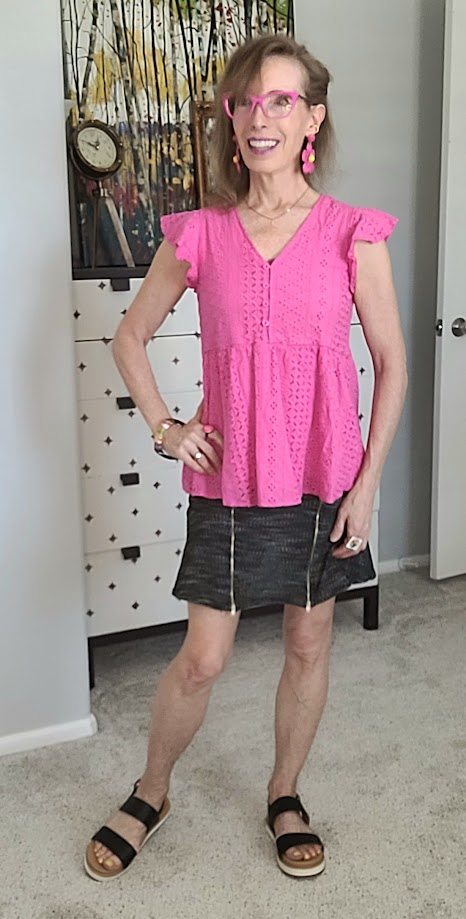 But today, with the flowy top, it seemed fine. Now if I had worn a tight cropped top, then it would be too “young” for me.