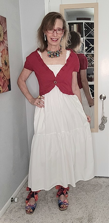 My silky sandals and necklace brought in the red from the cardigan but also other colors. I have to admit that these sandals have been a fabulous buy. The comfort is incredible considering they look higher than they are. And the material is so soft and easy to wear. PLUS the colors go with so much in my closet.