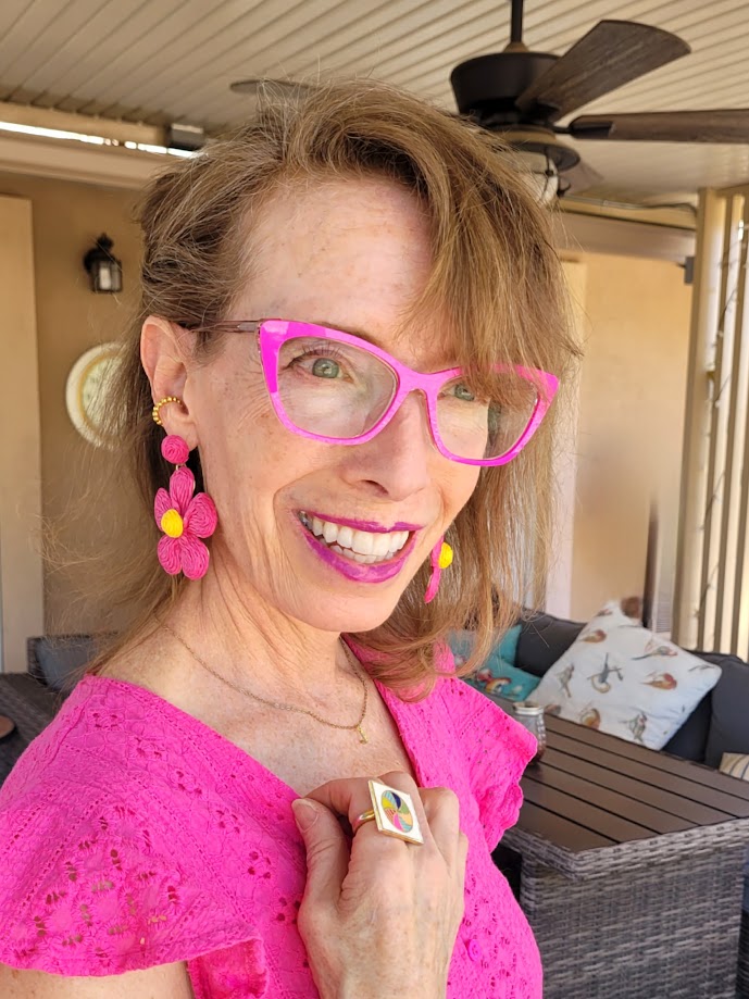I wanted color somewhere so I wore turquoise earrings to bring out the turquoise in my glasses.