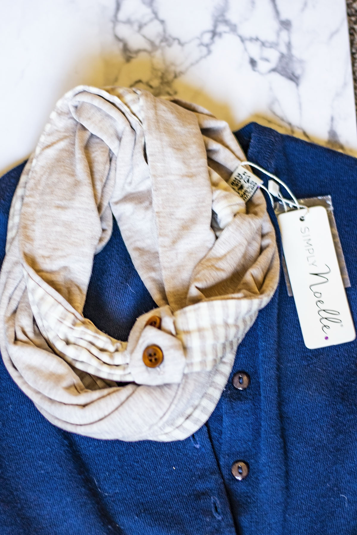 I am actually gifting this scarf that I was given when we went to their recent fall fashion show. I already have one like it, so I thought one of you could appreciate it. It’s a knit, infinity scarf with a pretty button band as decoration.