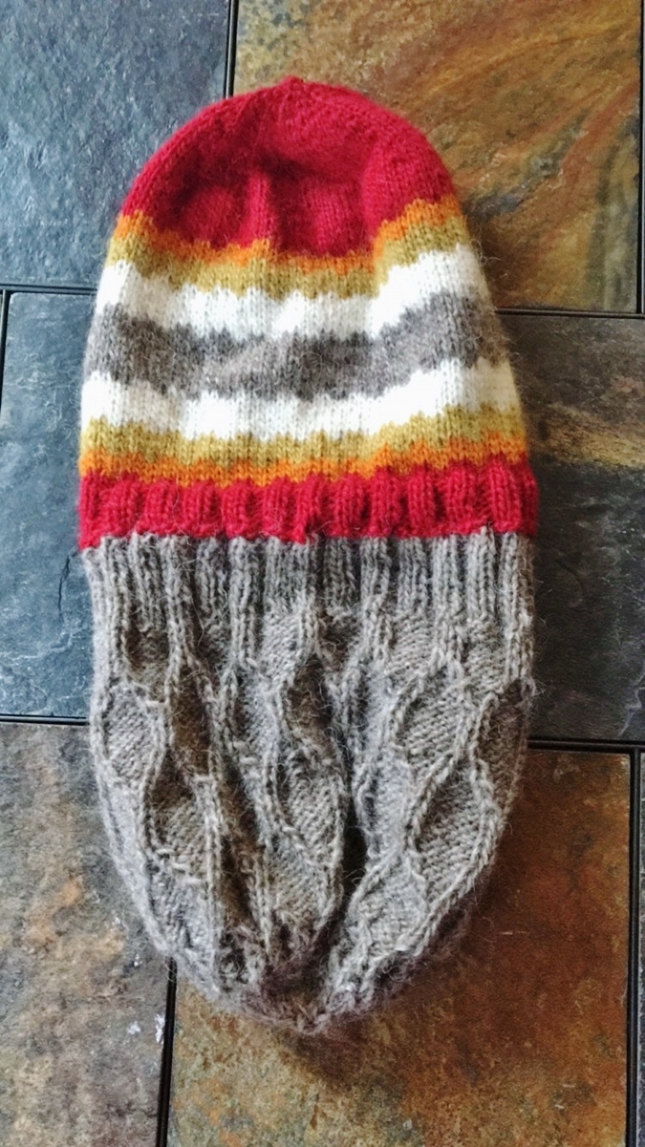 12-23: We stayed in today and I was able to get a lot of alterations and knitting finished. The above knitting project was finished with the leftover yarn from the fair isle sweater. It’s a 2 in 1 hat. You push the one end inside of the other and voila—you have either a striped hat or a cabled hat!