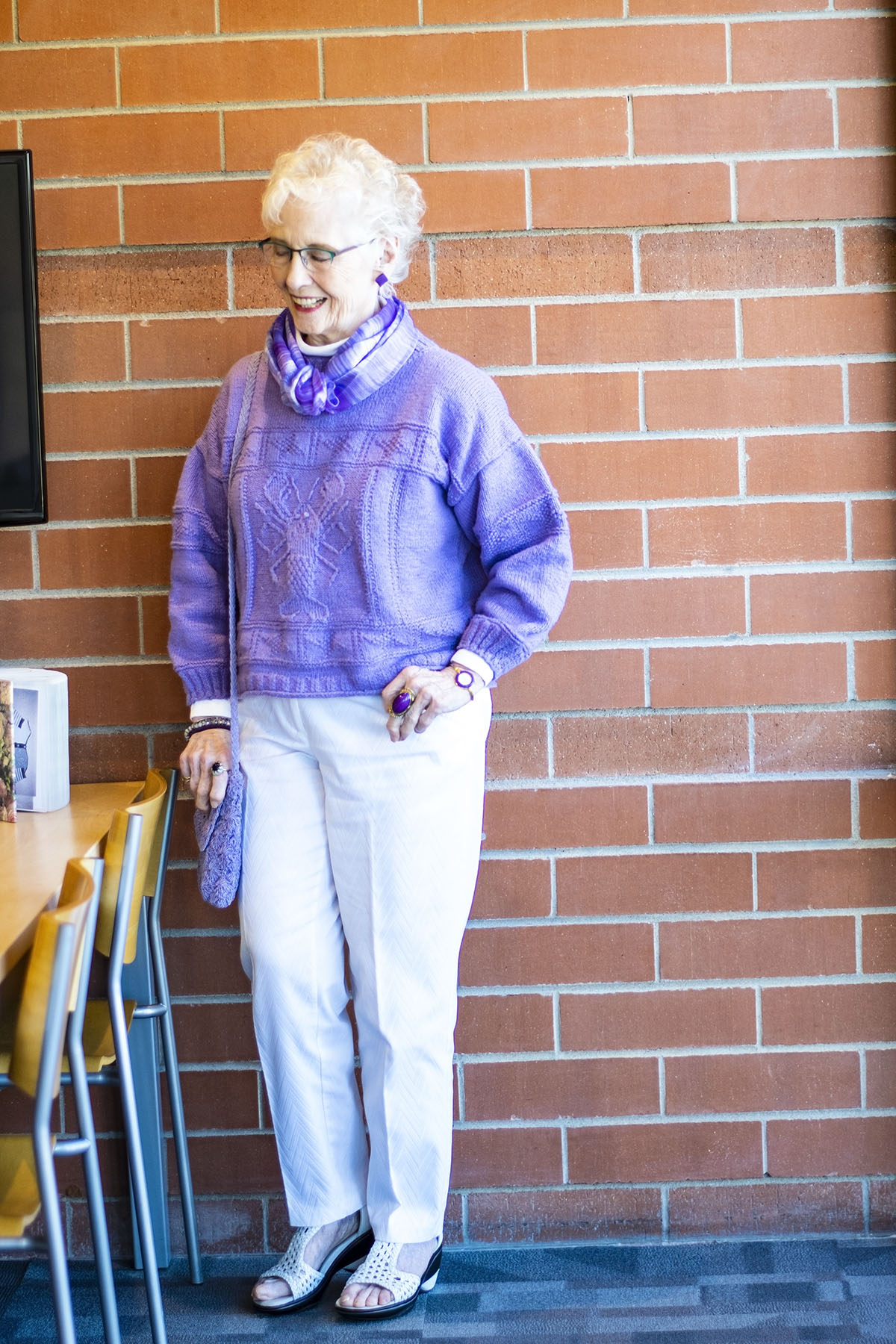 My mom chose the white Sandy sandals like I did. And since she loves to match so much, I asked her to wear her white jeans with the white sandals. We had to dress somewhat warm since there was still snow on the ground. Yet don’t you think this lilac sweater is very spring like?