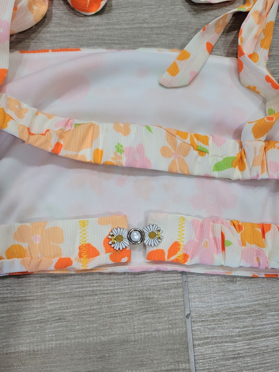 For my flower top above, I couldn’t just cut the elastic and sew it together because it would have been too tight to get on and off. That’s when I remembered that I had bought this daisy buckle years ago. The buckle is meant to tighten a waistband, yet this was the same concept.