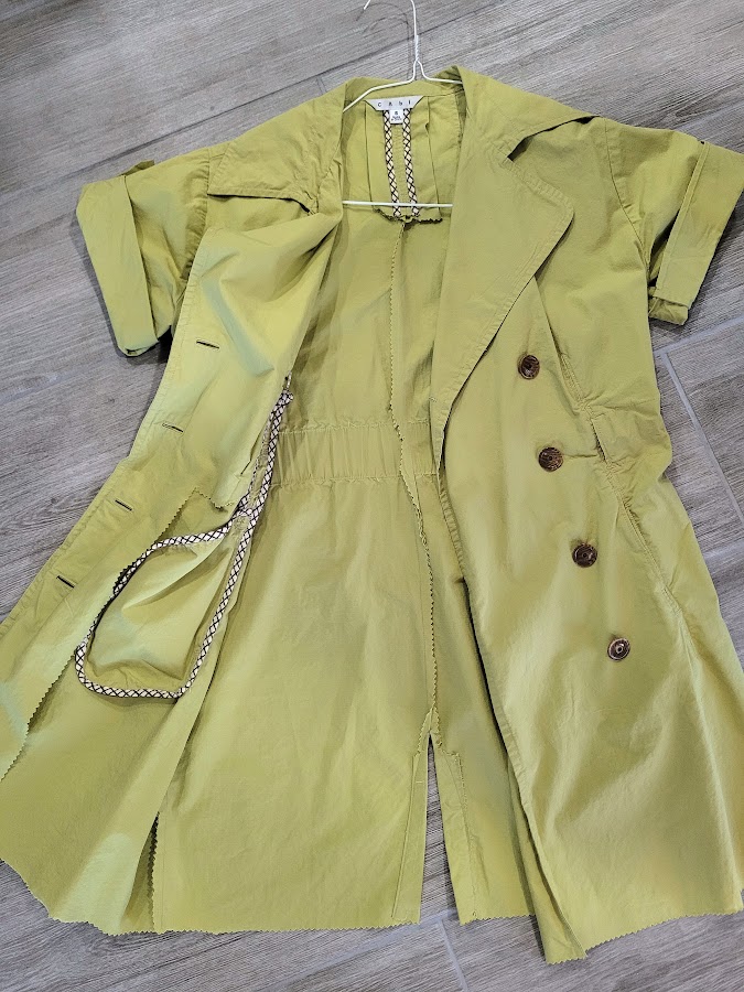 - Took off the trim on the inside which covered the hem. It was too heavy for the material and caused it to hang strange-used pinking shears.