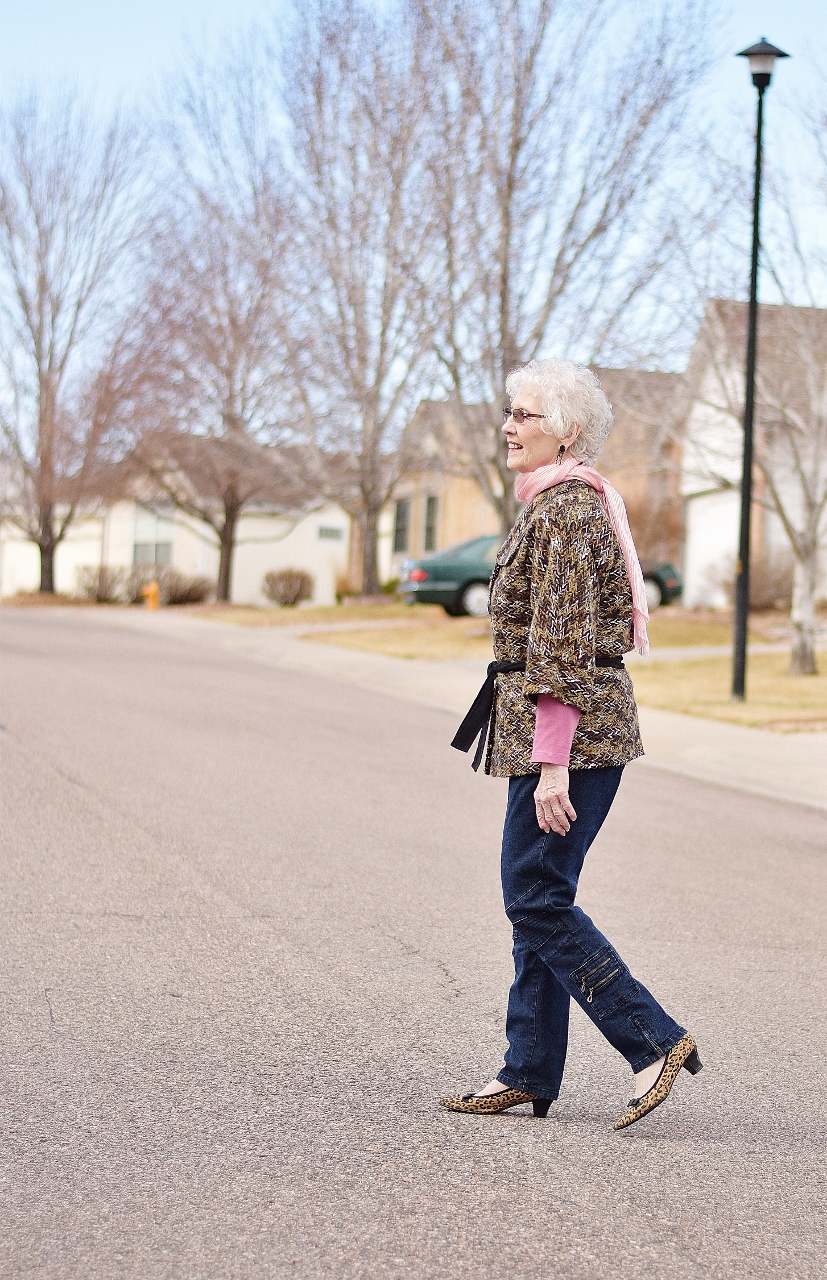 Charlotte’s (70’s) Outfit: For our last example of adding print shoes with another print, my mom went with matching colors. This shouldn’t surprise any of you, but I’ve been telling mom that I still get veto power when she chooses her outfits!! LOL!