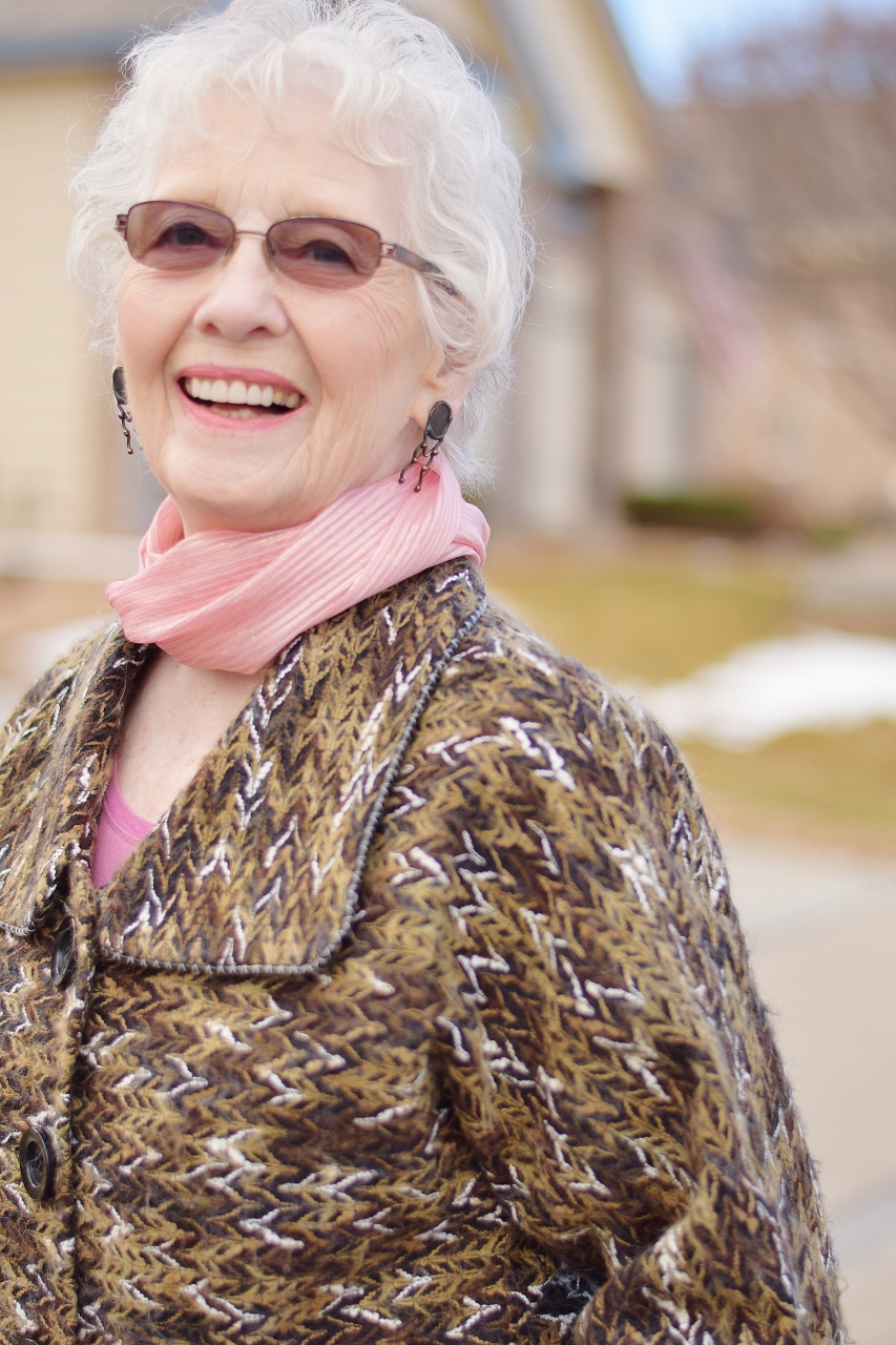 I really think you could choose many different colors that would look nice under this cardigan, don’t you agree? I went with pink only because pink would stand out against brown. And then the scarf came into the picture because my mom still likes to cover her chest when it’s exposed like this. I know this is her habit, but she really has the nicest skin, and I try to keep telling her that she doesn’t need to cover it all of the time. But I let her wear her scarf…I just had her put the bulk of it in the back!