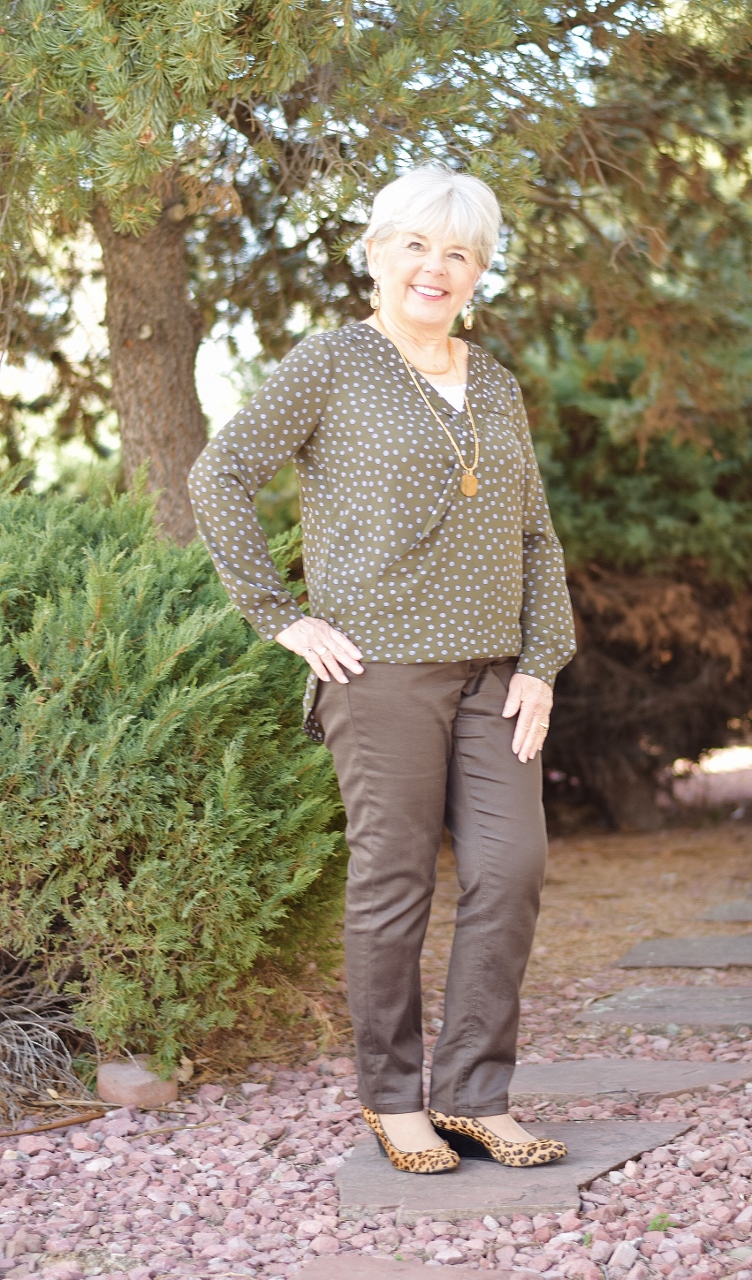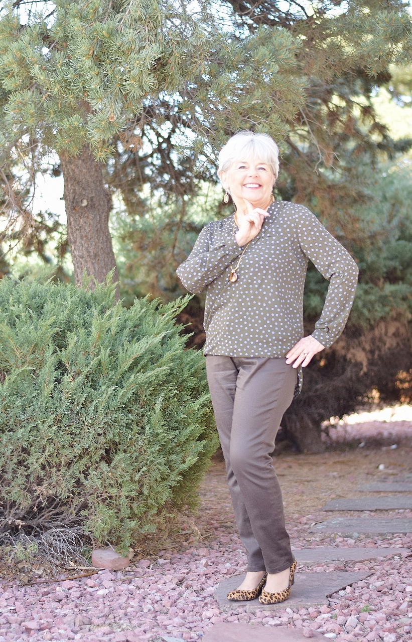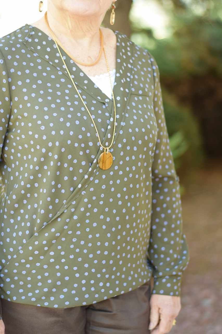 Then to add in Nancy’s other print, we picked out this blouse. I wanted a color that didn’t “match” the shoes, but one that many of you would feel safe in wearing! So the olive green print blouse won out!!