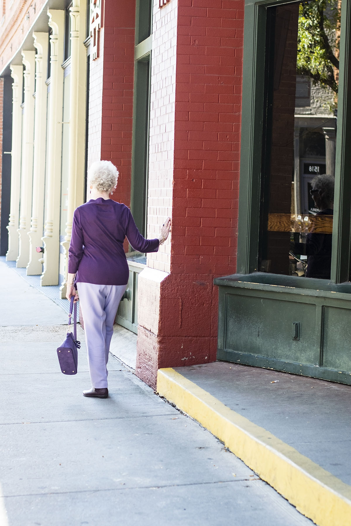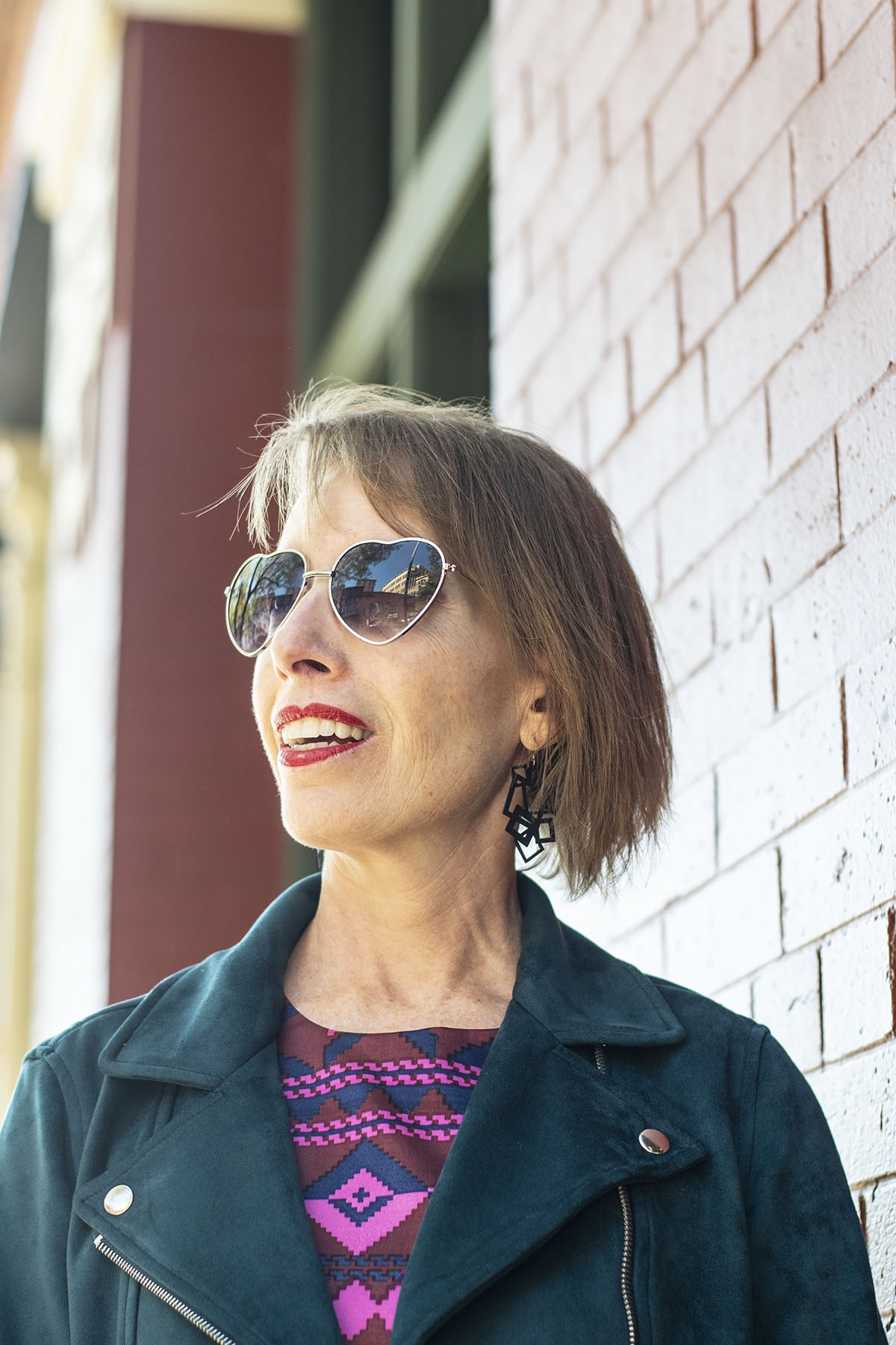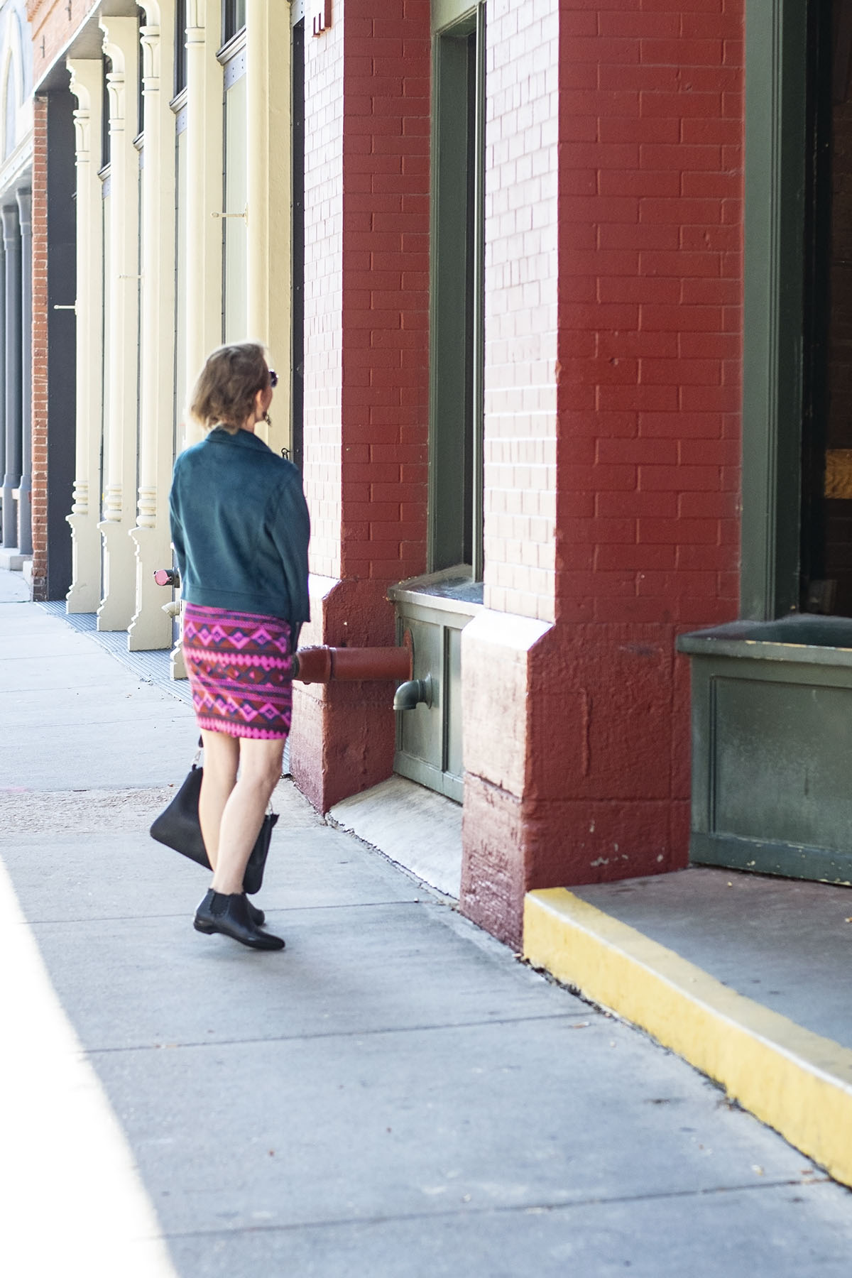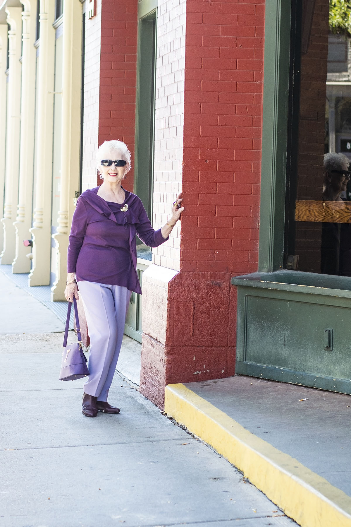 If you know my mother, then you know how she loves to continue a color throughout her outfit. Since she chose the plum booties, she found a top that was basically the same color. And then, of course, found another purple in her closet to wear throughout her entire look.