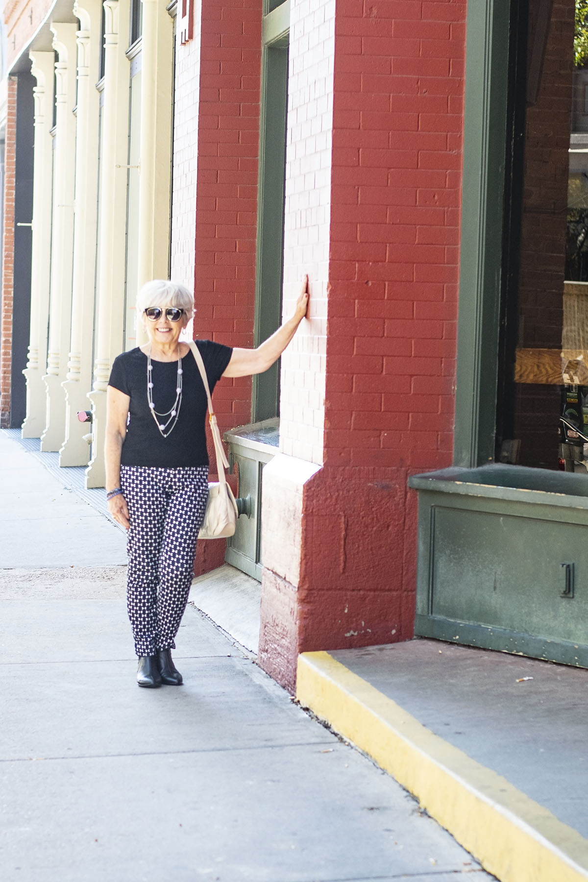 I love how Nancy even incorporated a little print mixing in her outfit with the print pants and striped bead necklace. We have experimented with print mixing many times on the blog. It may not be your first thought when putting together an outfit, but home and clothing designers use this trick all the time.