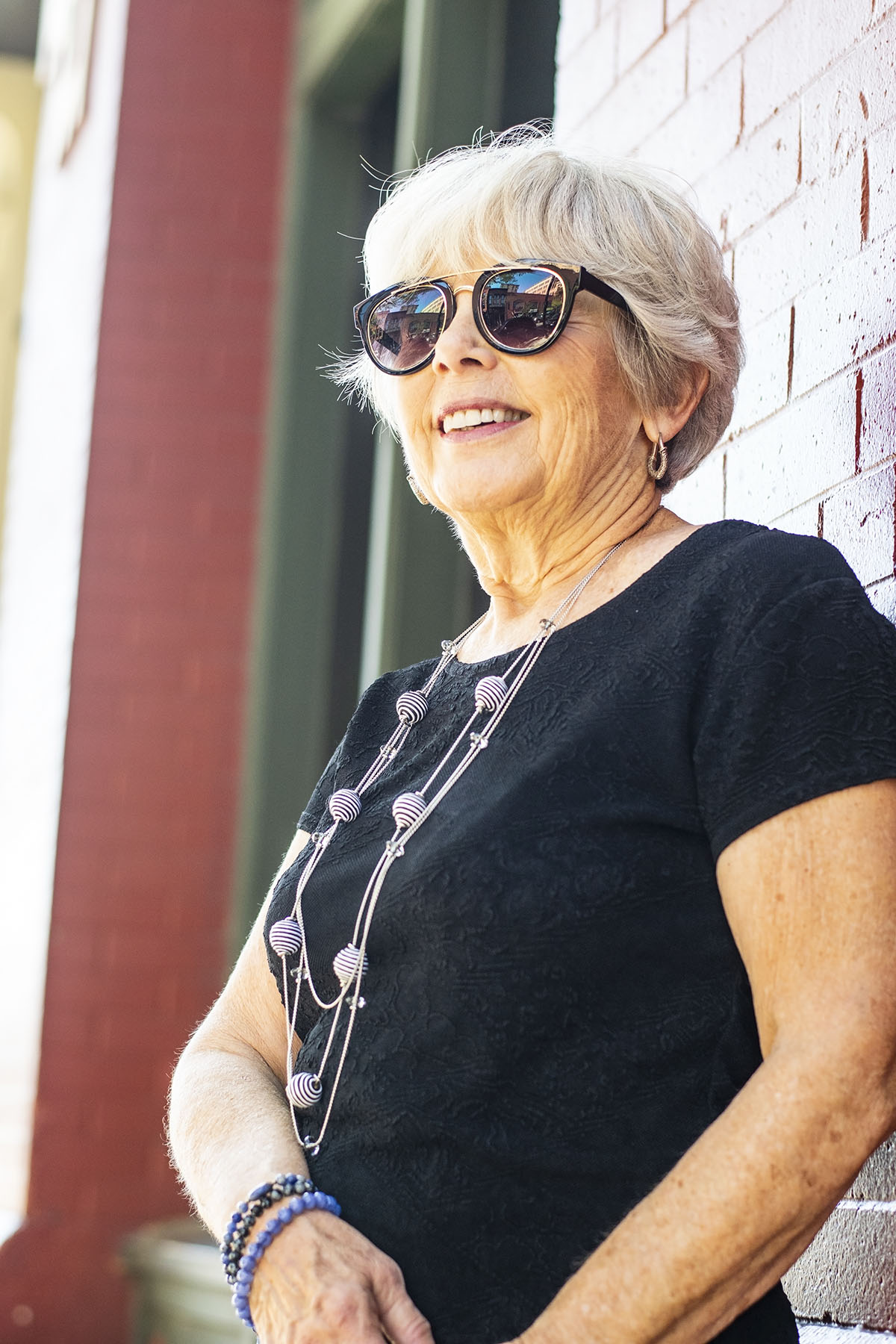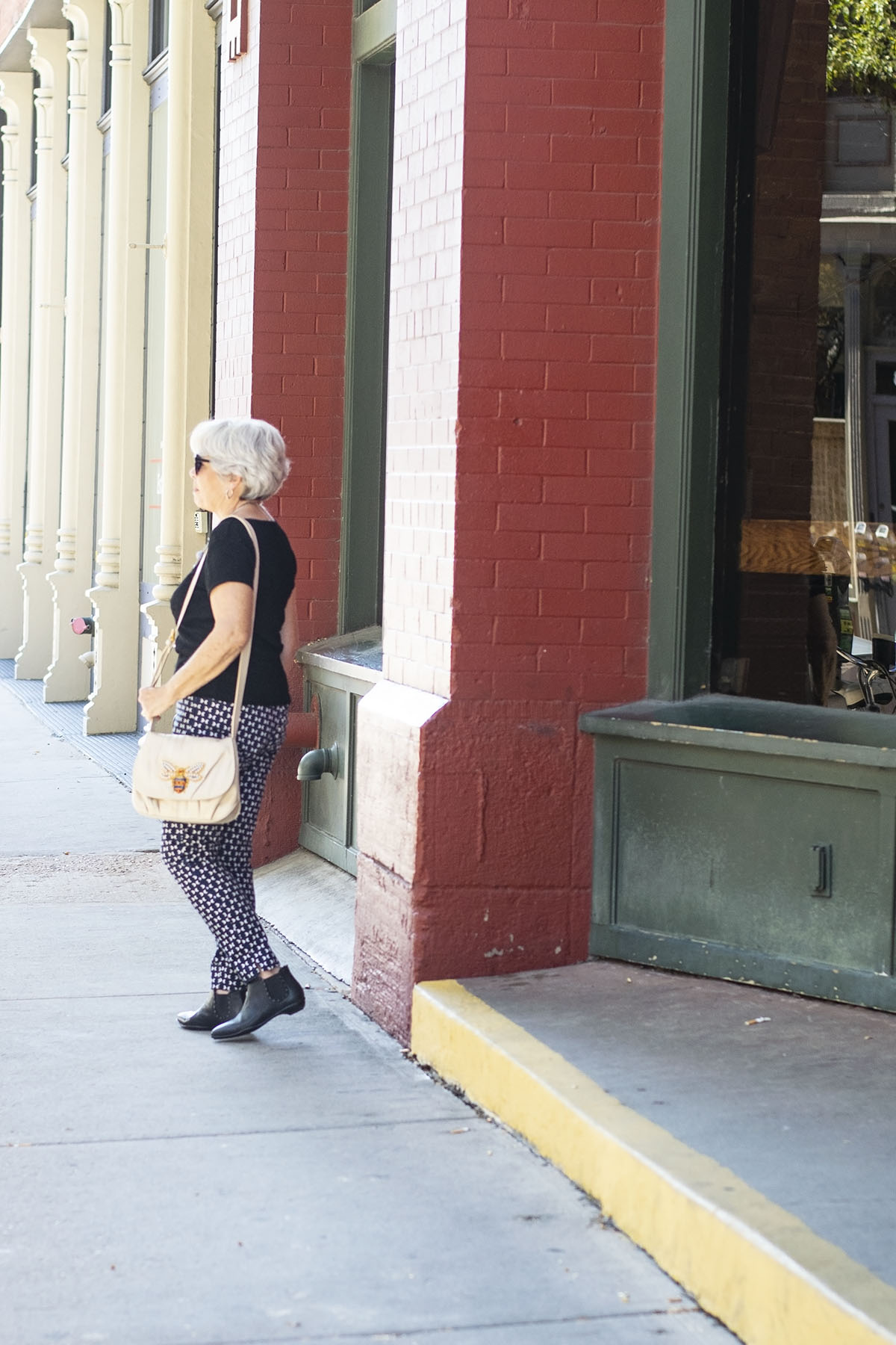I’m so glad that Nancy paired this black top with her navy print jeans. The jeans themselves have both navy and black in them, so I think it’s a great way to get used to these colors next to each other.