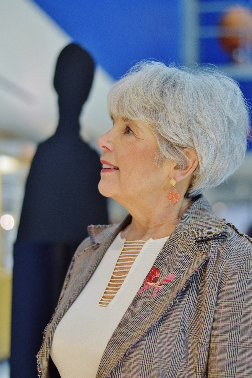 Even though orange is not a predominant color in Nancy’s outfit, she did add in a little with her earrings. And there is a little of the same color in the embroidery on her jacket.