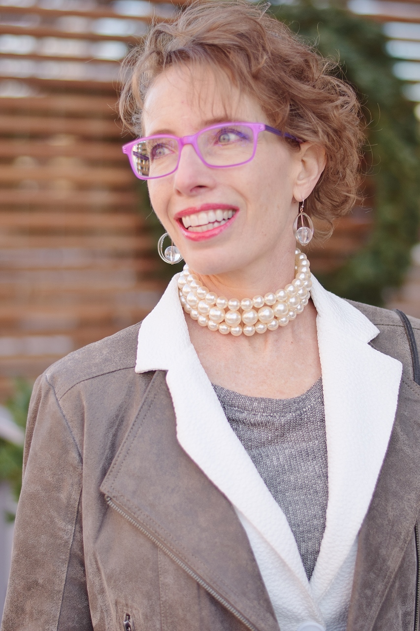 The choker necklaces are still some of my favorites. Because with a thicker one like this pearl one, you don’t even see the wrinkles on my neck. We could call it camouflaging with pearls, LOL! The necklace was found at the consignment store we visited in Frisco recently called the Funky Trunk.