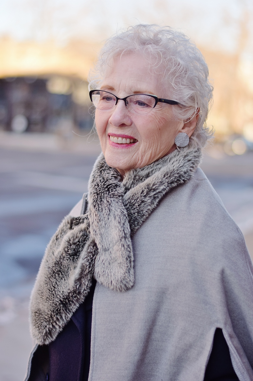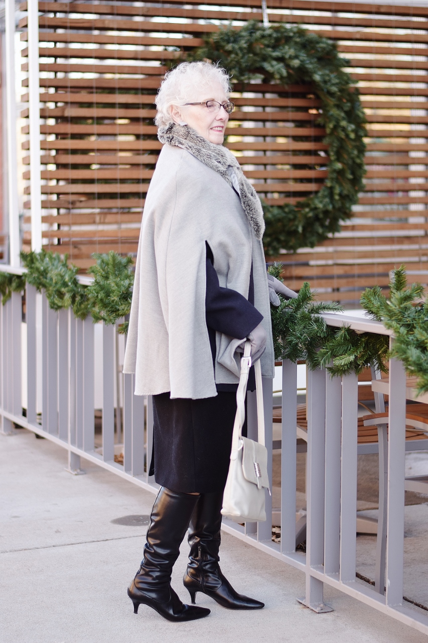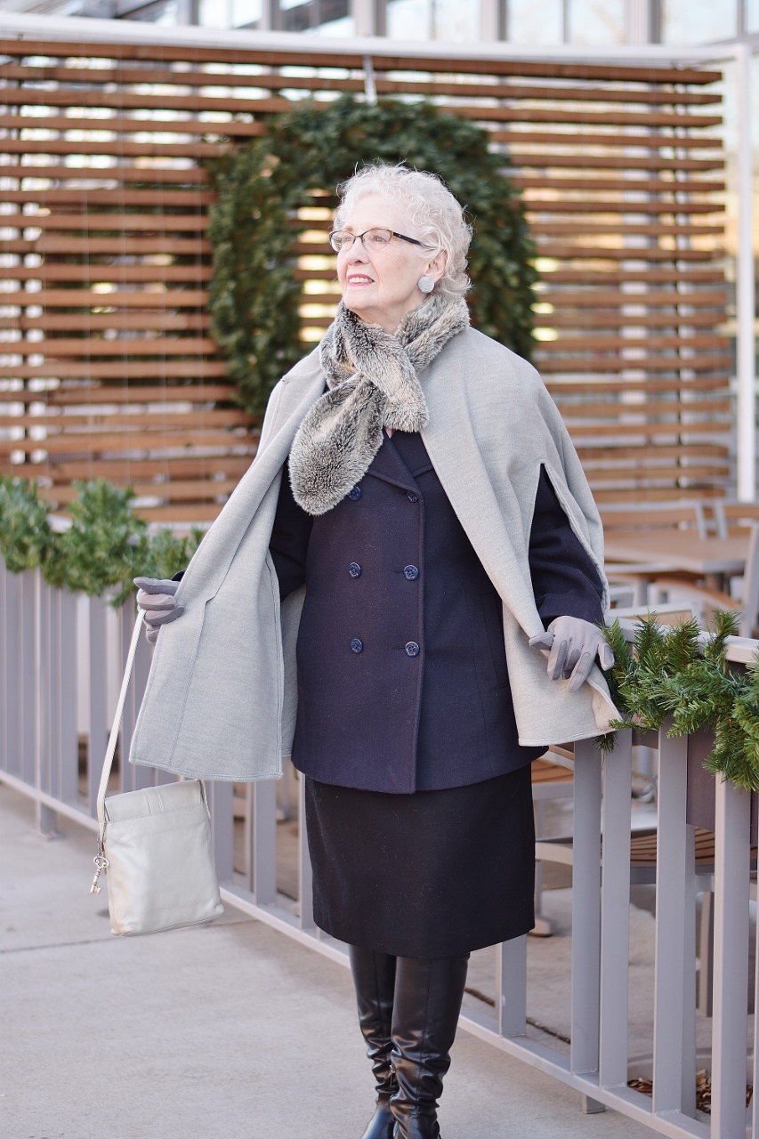 My mom’s coat under her cape is a dark purple, wool one. If you have a solid colored coat that needs a little pizzazz, then adding a cape over top of it may work for you.