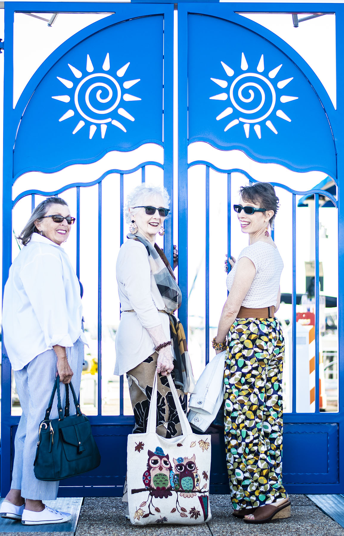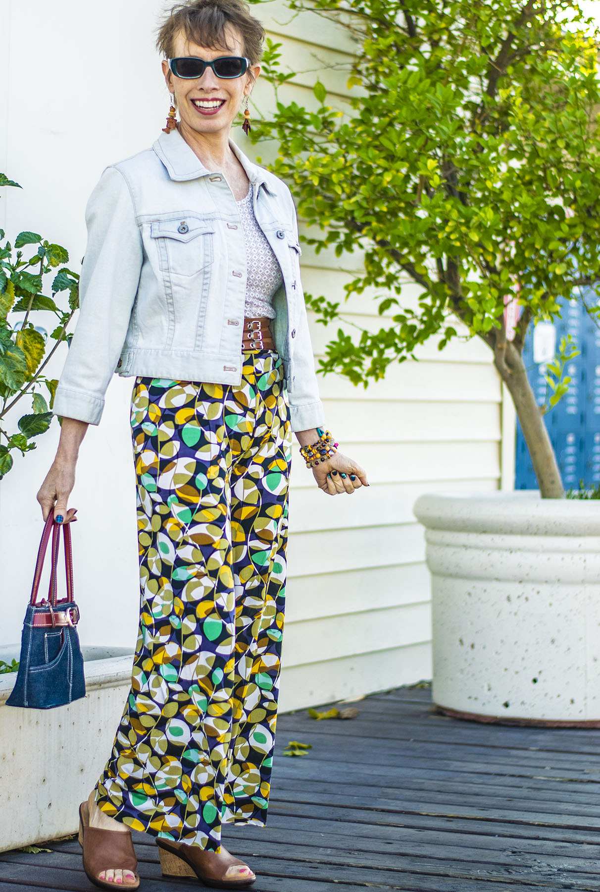 My girl group of 8 different women in 8 different decades of life are talking about how to wear print pants. Well, actually the theme was statement pants which could certainly include solids too. However, I asked Lesley and Charlotte to go big or go home. And I love the variety!!