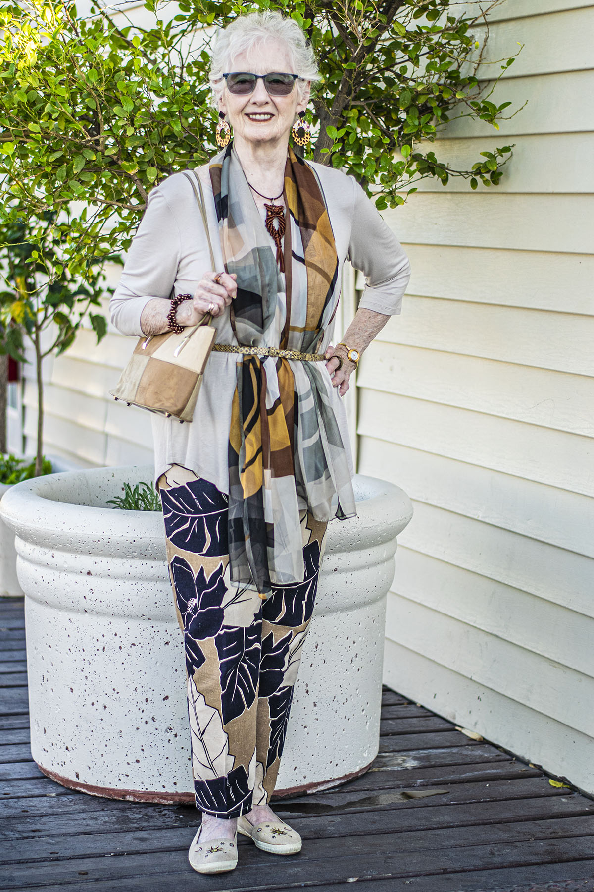 My mom found these pants secondhand and just loved the bold pattern even though she usually favors plain colored pants. The colors in the scarf and earrings mirror the colors in the pants and tie it all together.