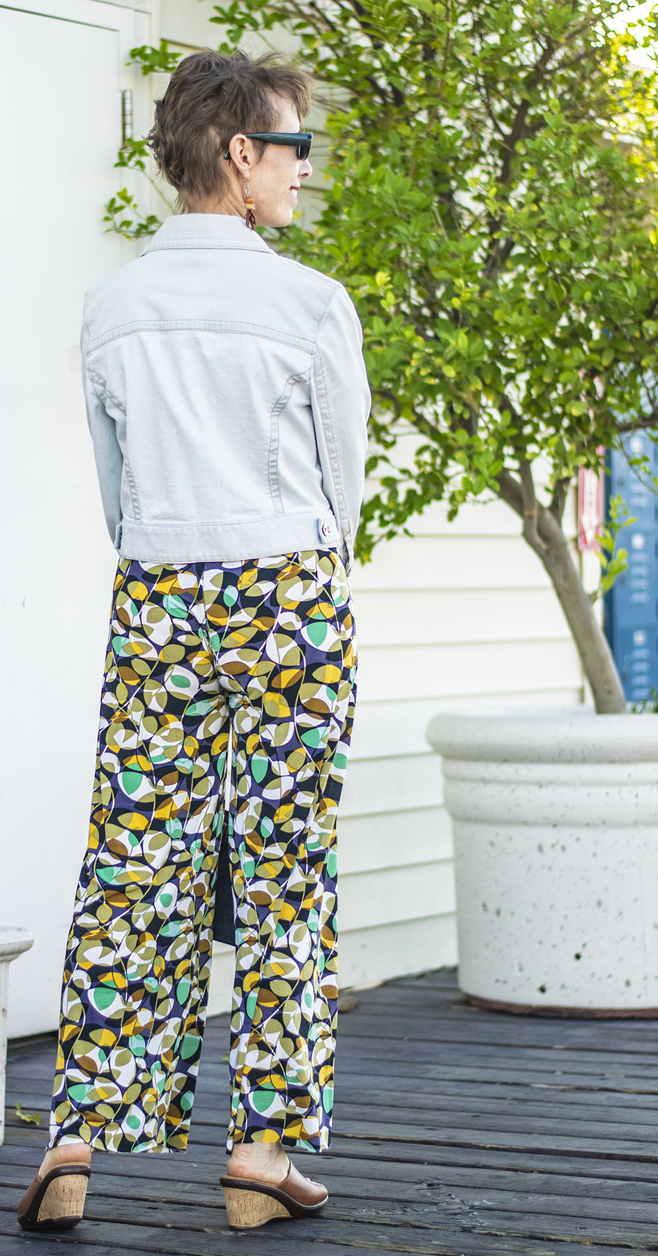 Lesley’s words: “These pants fall into two categories, full legged and paper bag waist. Because they are so distinctive, I kept the top simple. I also tucked in the top because of the tie at the waist. This is quite outside of my comfort zone because I am thick at the waist.: