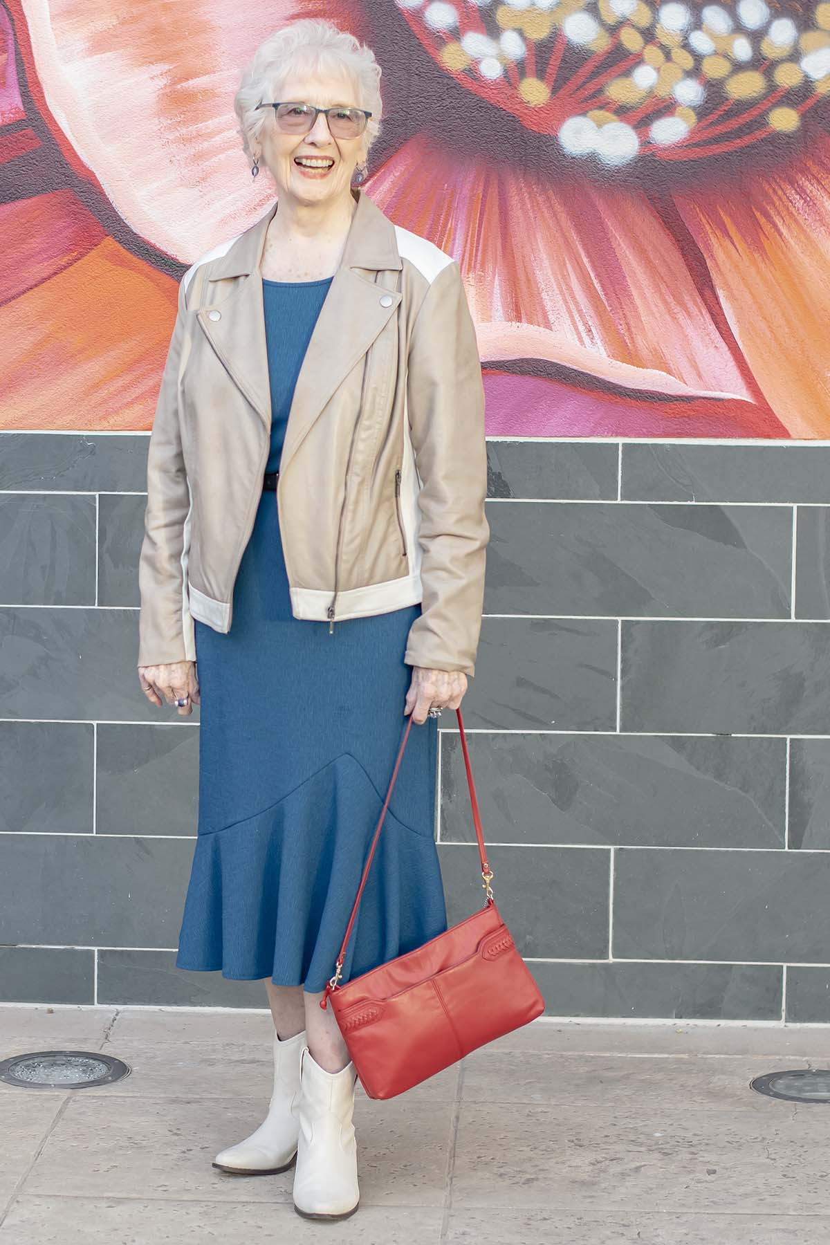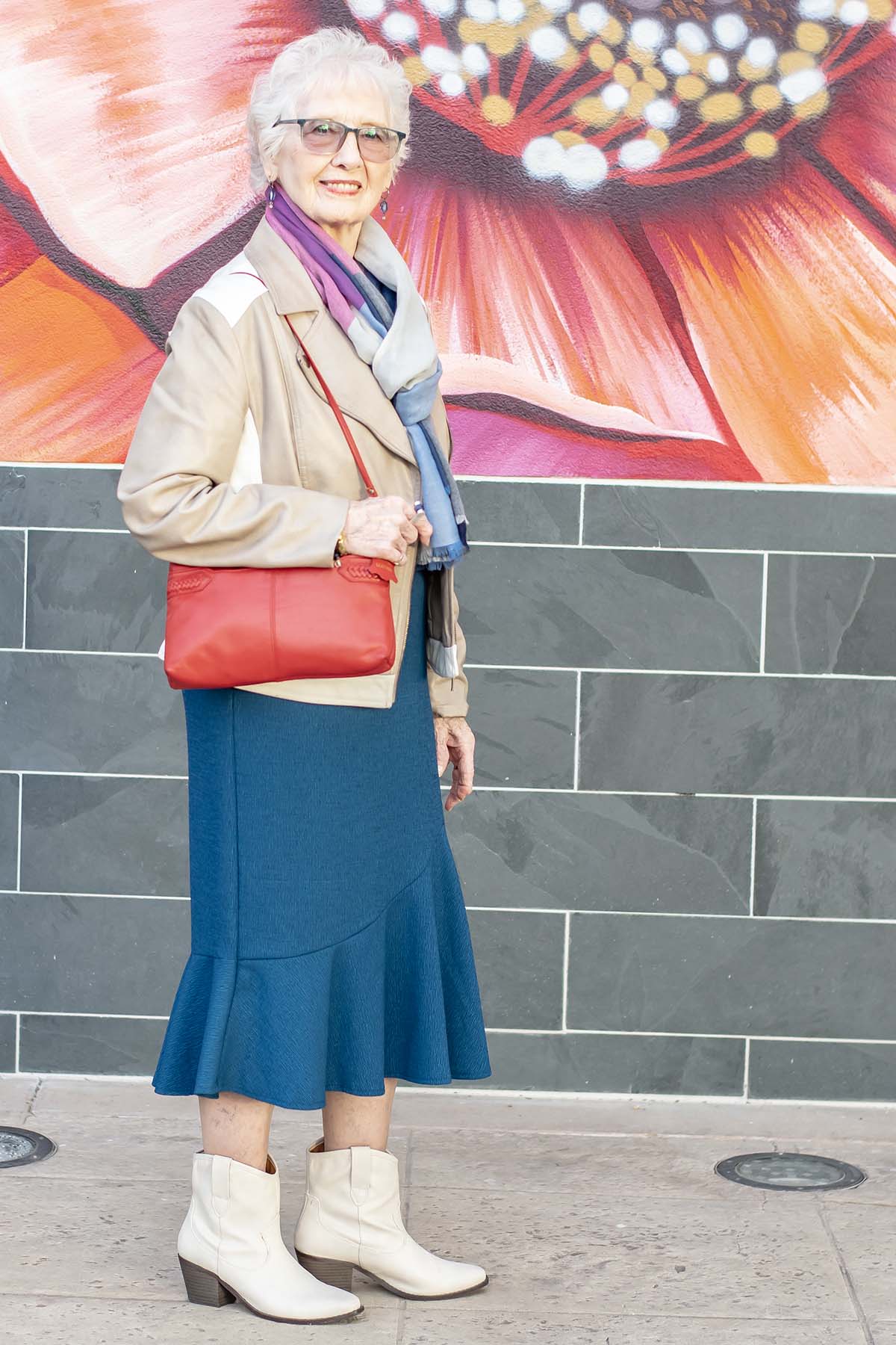 And then the red purse is a great way to add a focal point and something of a different color. There’s no frump here!