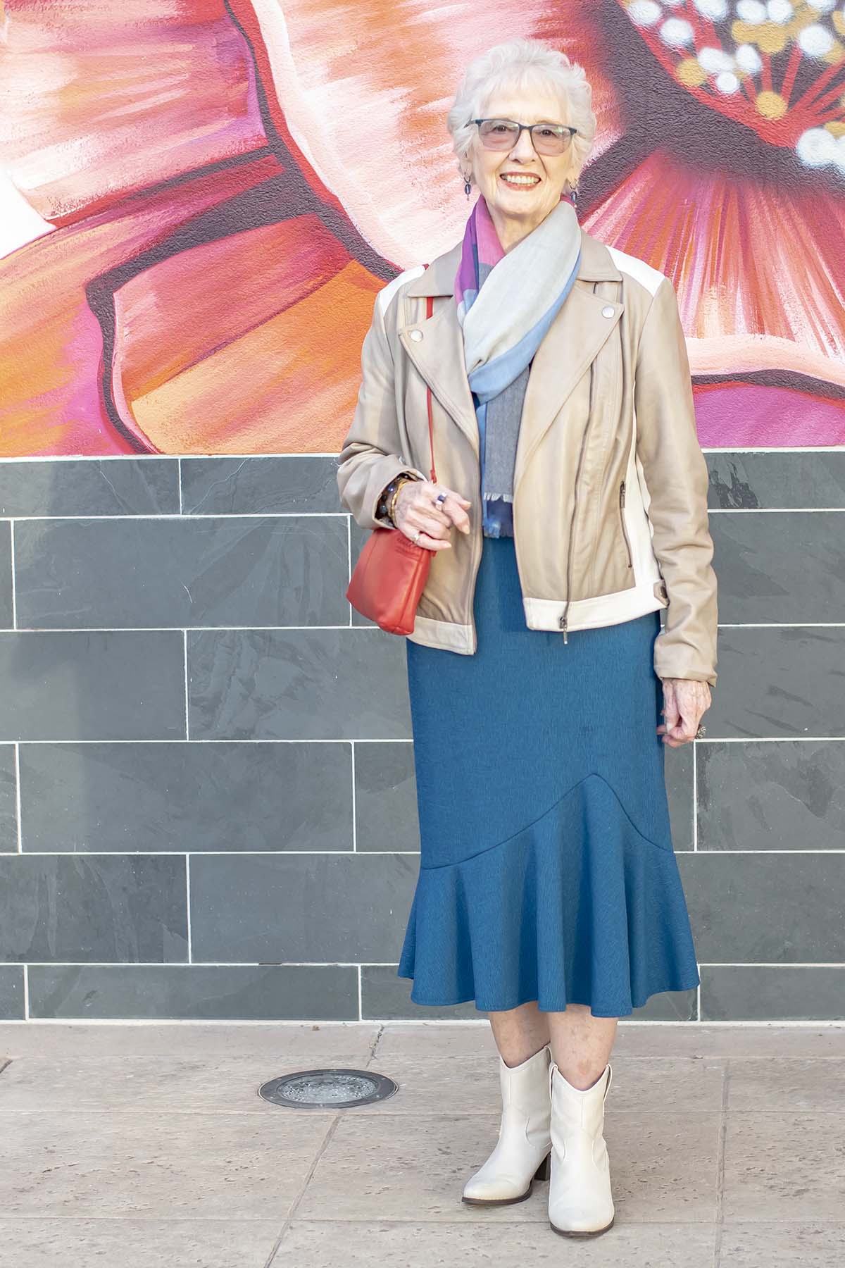 3–Proportions or balance. It’s especially frumpy to be wearing items that are too loose and baggy because it gives off a sloppy vibe. Yet as older women, we tend towards looser items instead of tight clothes. Thus, working with proportions and finding a good balance can be the key to an outfit that shows how fabulous you are.