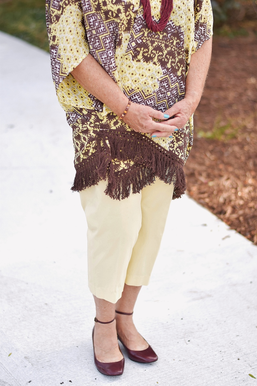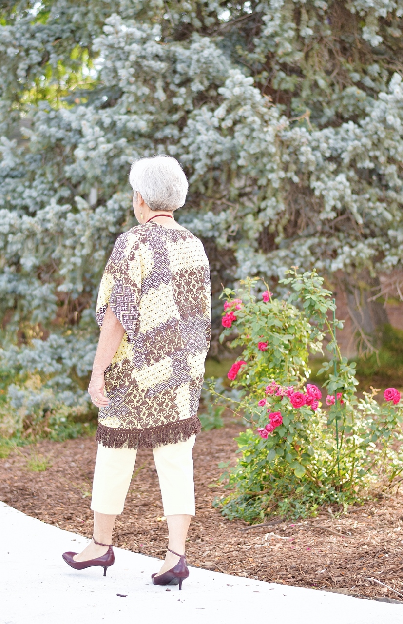 This wasn’t my unique idea, since just recently I saw a blogger wear a kimono as a top. Can I remember who it was? Of course not, but I thought it was a brilliant idea. It took a little pinning and taping in order to keep the kimono closed, but I had Nancy wear a shirt under it just in case.