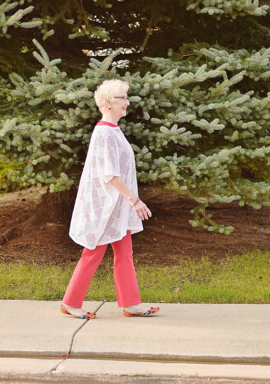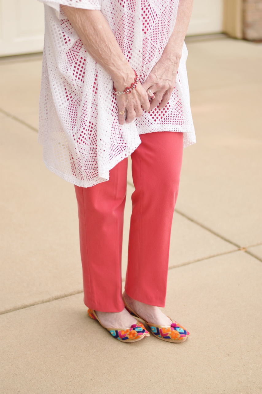 My mom luckily loves color almost as much as I do, and so she wore this tunic over a column of red. I remember when red jeans were a big deal, and I couldn’t ever imagine wearing such a bright colored jean. Luckily I’ve gotten over that, and I hope I inspire you too.