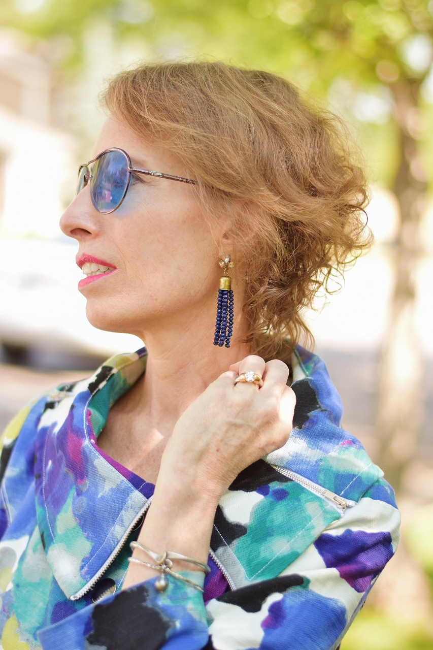 Since there are zippers and an asymmetrical neckline to this jacket, I decided to forgo a necklace and stick with some fun earrings. I have been buying quite a few tassel earrings lately, and if you like the look too, then here are a couple more. This is an ombre pair, a lighter pair or even a combo color that would be fantastic especially if you are a Bronco football team fan.