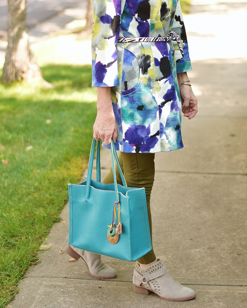 The grey booties have been worn quite a bit since I received them from Soft Surroundings. I had them on originally with the white leggings, but kept them on even with the olive green leggings, just to lighten the outfit. Of course, black or brown booties could have worked too.
