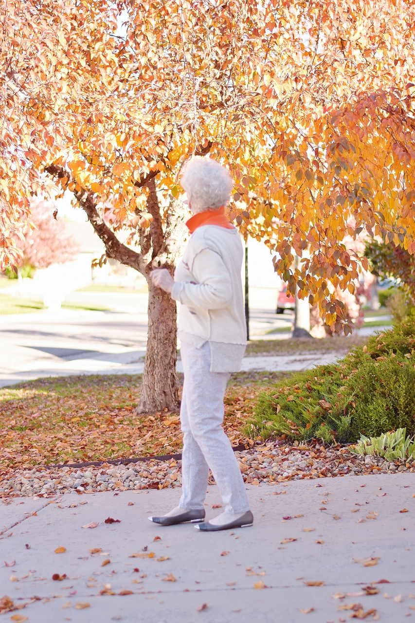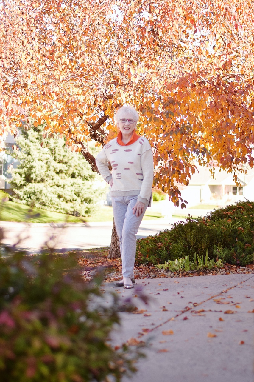 So my mom took her orange polo shirt and layered it under her new sweatshirt that she bought when we were in Seattle at Drizzle and Shine. I know many of my older friends don’t love the distressed jeans, so I was pleasantly surprised when my mom picked out this sweatshirt on her own. Sometimes, I think the more we see of certain styles, the more we grow used to them, and don’t think they are as crazy anymore.