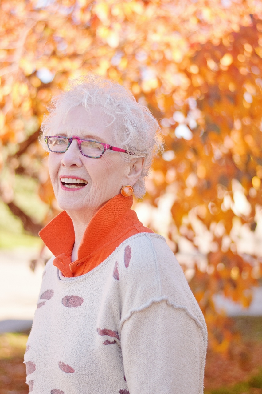 Charlotte’s (70+) Outfit: My mom wore her orange for fall with her light blue print jeans.
