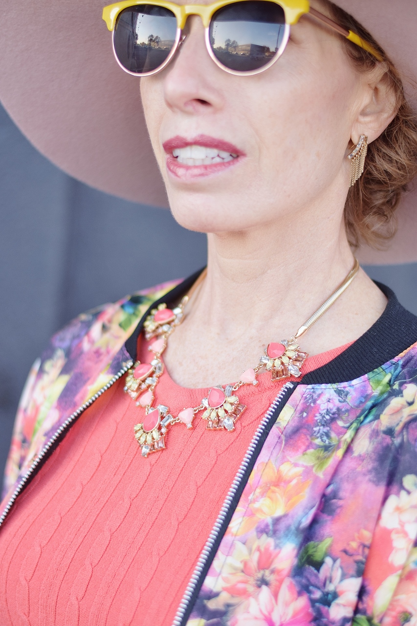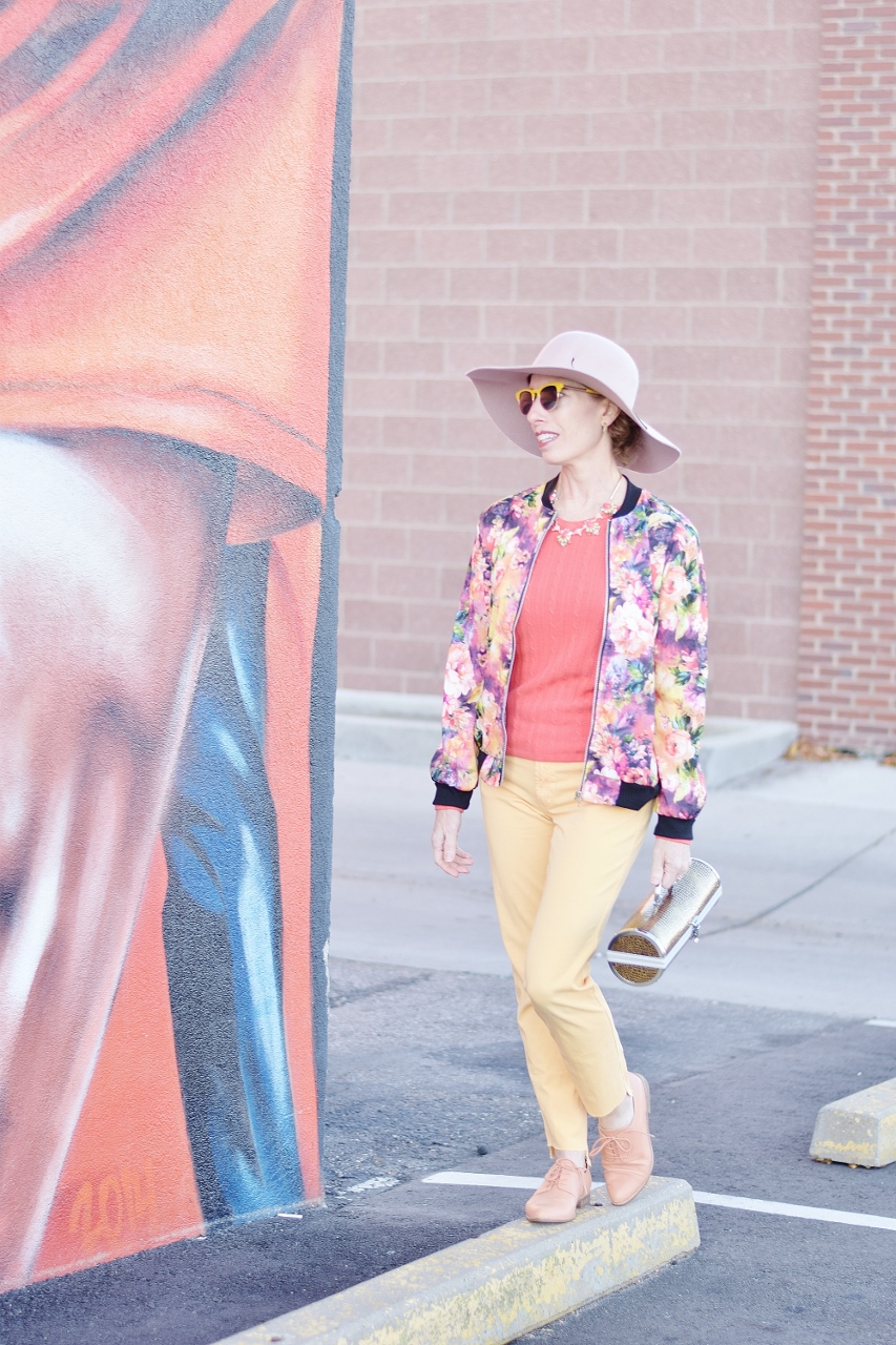 I only grabbed this floral bomber because it was still hanging up in my closet after my friend, Jude gave it to me on our Seattle trip. I looked at the jacket and figured it had both orange and yellow in it, so I thought maybe it could tie the two colors together. And that’s how I came up with this outfit. It may be a little too bright for some of your tastes, but I would also hope you would look at this and realize I’m not going to disappear into the background. And that’s my personality to a tee.
