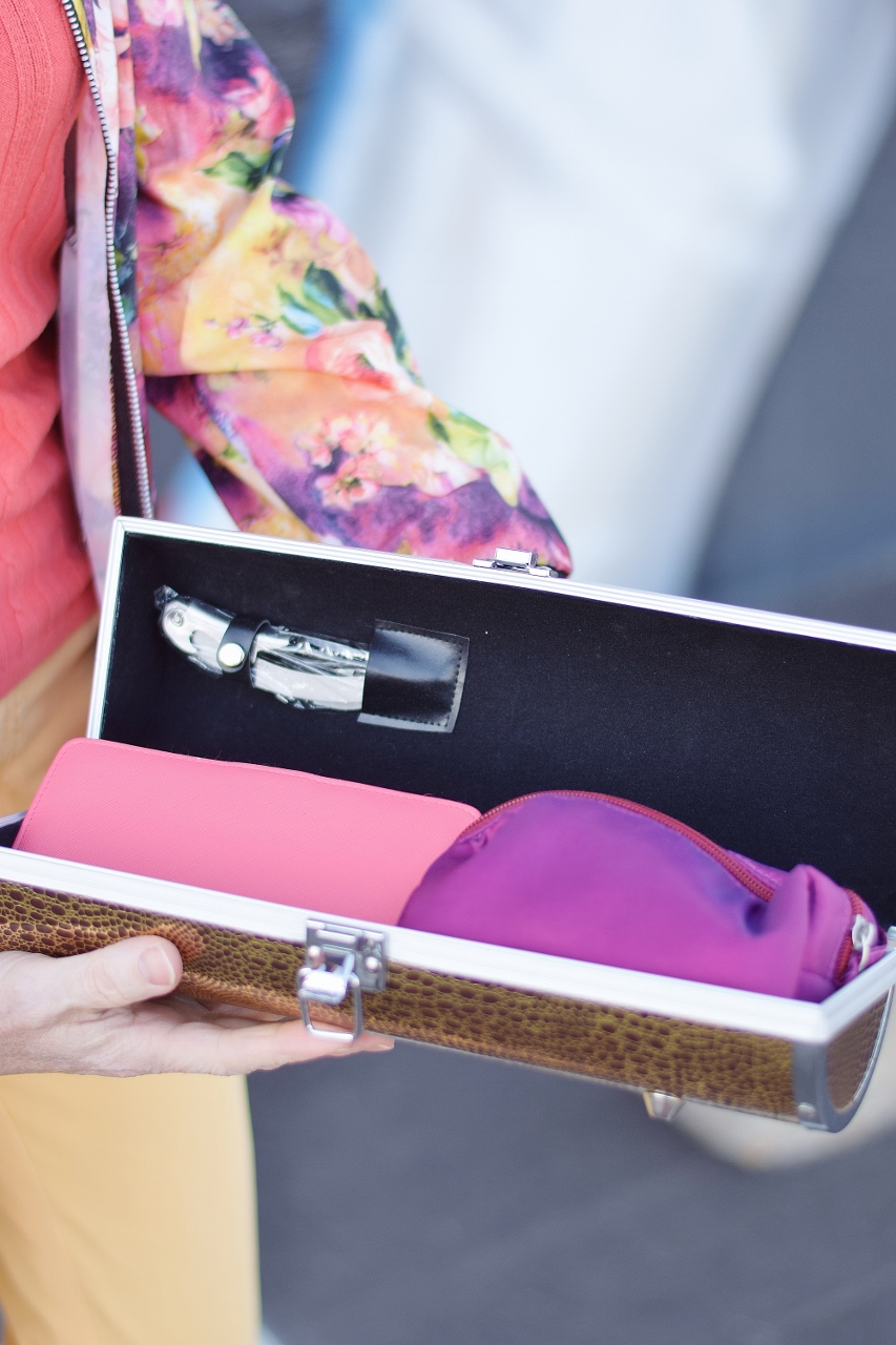 And you may laugh at this purse. I found it while thrifting, and thought it was such a great shaped purse. Well, of course, it’s a great shape. It’s actually made to transport a bottle of wine. Therefore I had to buy it, and figure out how to use it for real life. I was able to fit my wallet and my cosmetic bag in this carrier. And I had to show you the inside so you can see that it came with a bottle opener! Hilarious, right?
