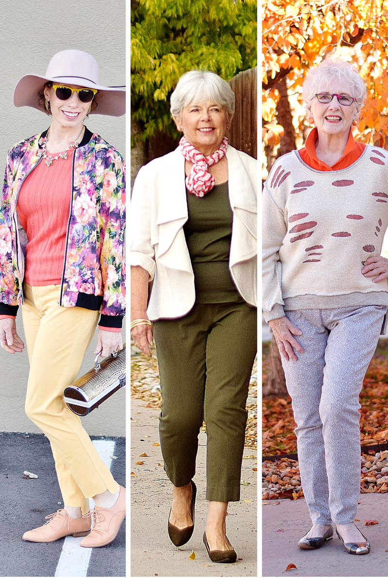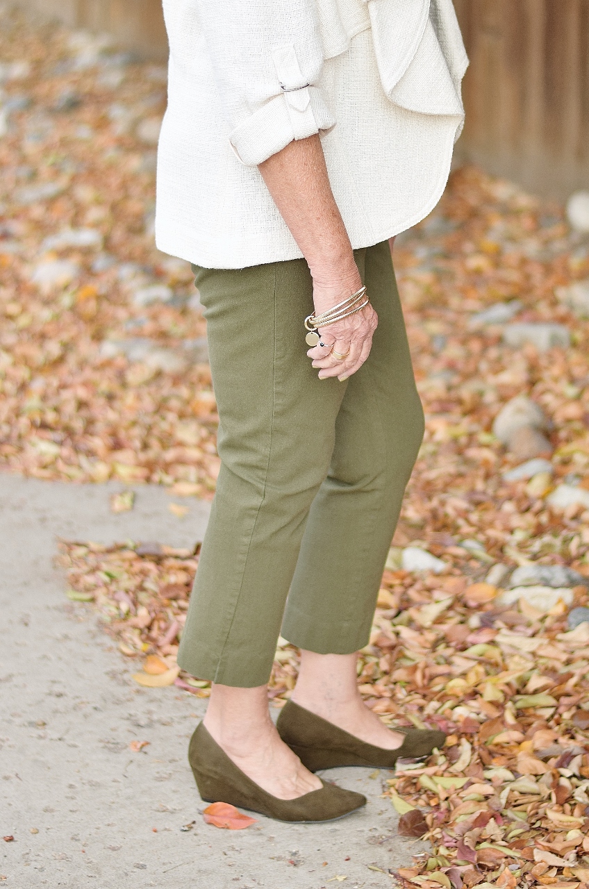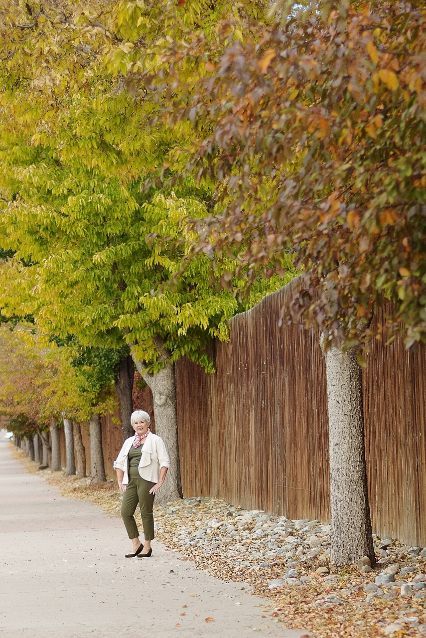 Nancy’s (60+) Outfit: I will give Nancy a little leeway about her favorite color. She is actually very open to trying new colors and combinations, and she has been accumulating more olive green lately.
