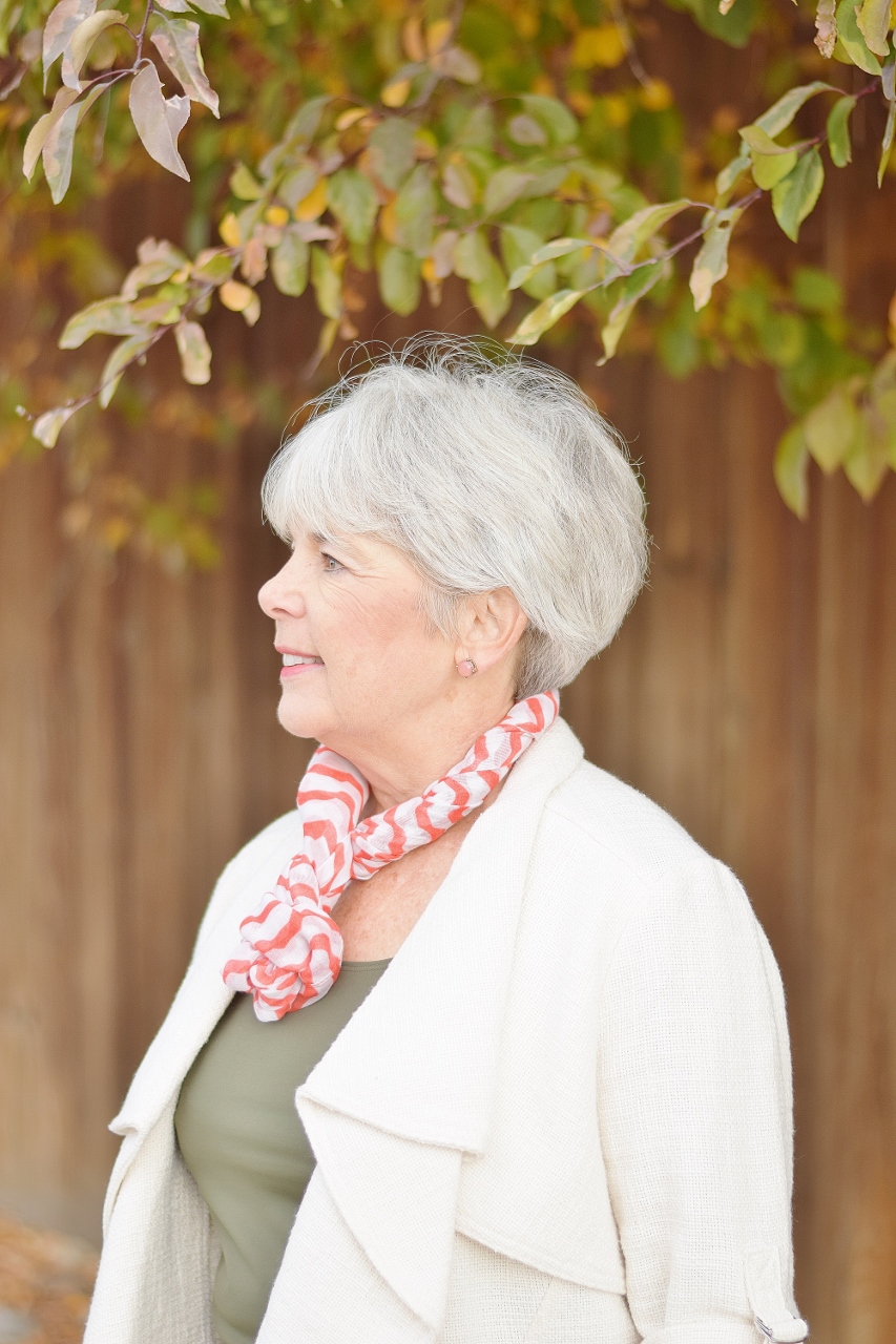 But Nancy doesn’t really have a lot of orange in her closet, so she grabbed her orange scarf and used that for a pop of color in this look.