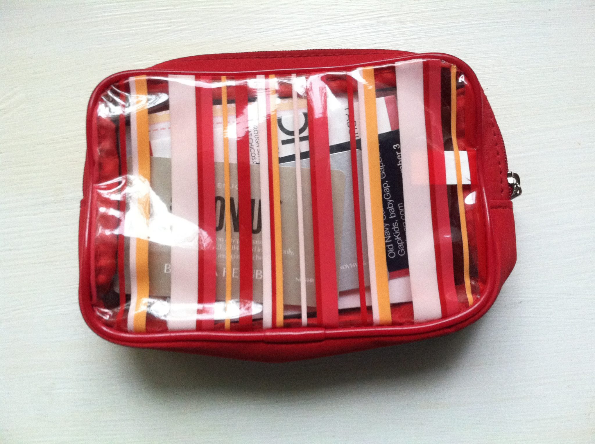 I have 1 small bag for flat things which really means primarily coupons. This is a great way to make sure I have at least one Bed Bath & Beyond coupon with me at all times. I also have any clothing discounts and receipts that will save me money depending when & where I am at the moment. I don’t carry restaurant coupons with me as we tend to plan those in advance. I also keep band-aids (for that occasional foot blister) and a napkin in this storage container (doubles for kleenex in a pinch). Maybe once a month I will go through it and throw out expired promotions.