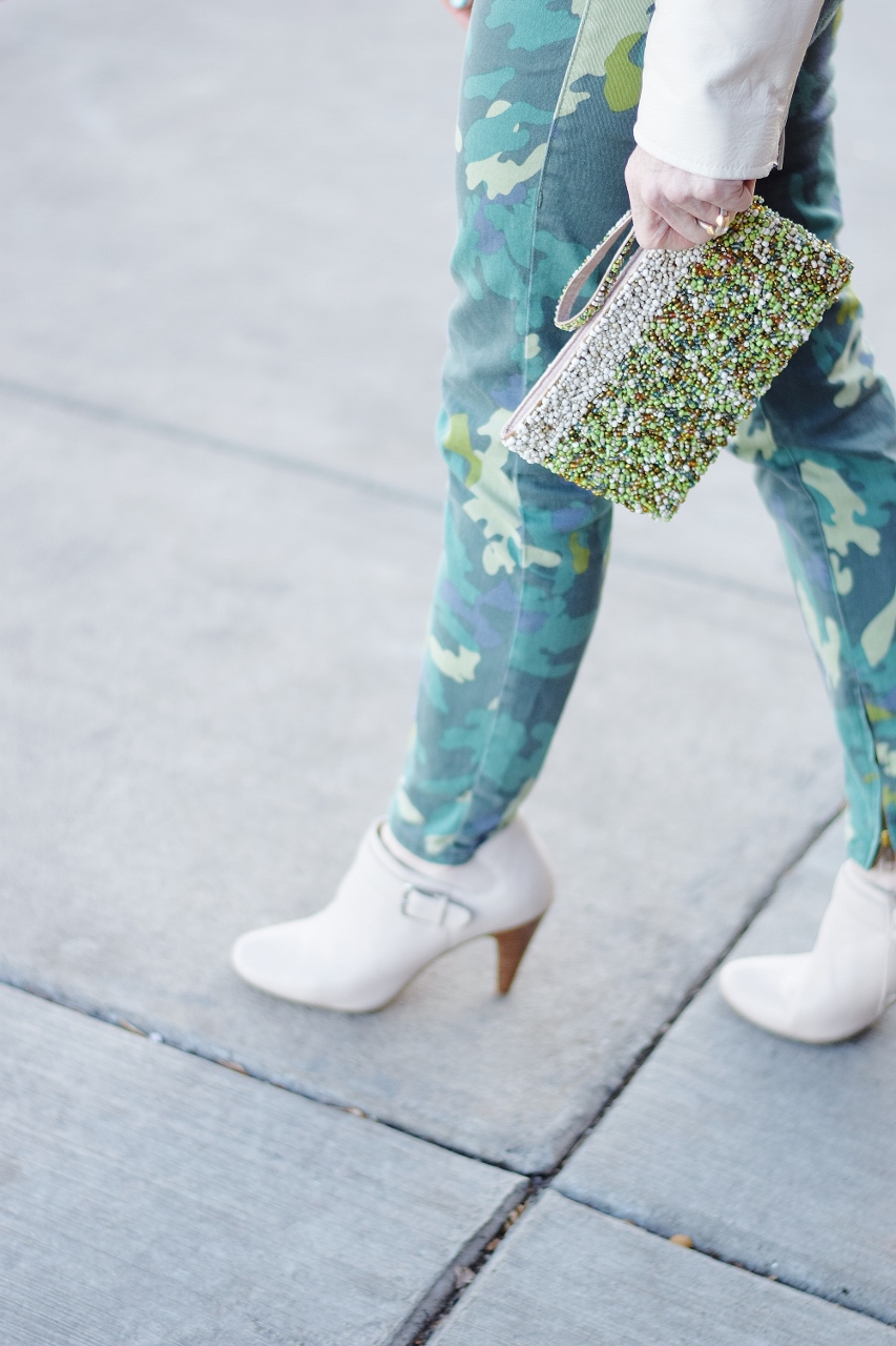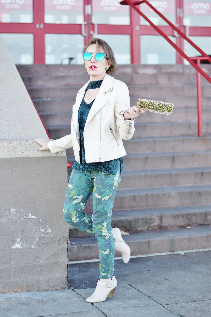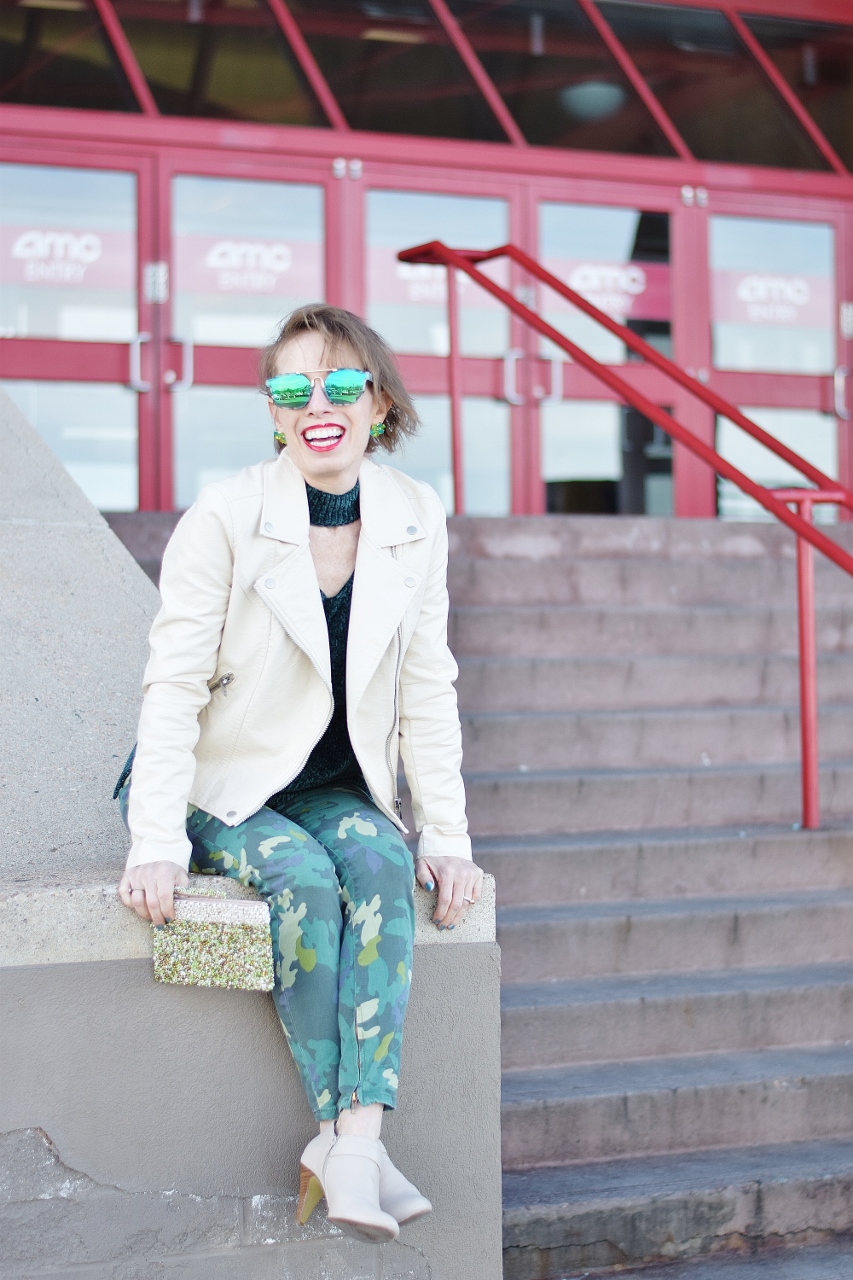 I actually started out with the camo jeans since she wore quite a bit of camo print in “RED.” All three of us have styled camo on the blog in the past even though in my youth I would have never thought I’d wear it.