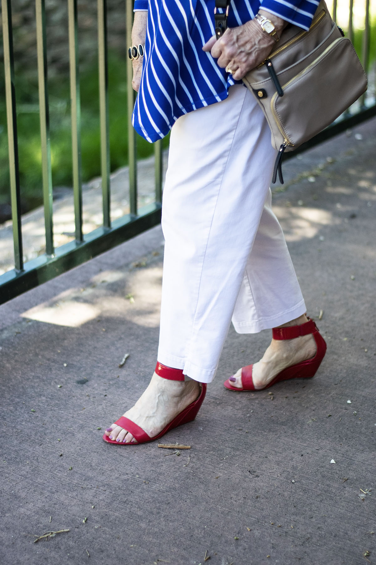 Nancy started by choosing this blue tunic from her closet. She’s worn it before with other white pants on the blog. The original pants she was going to wear were capris, and the proportion didn’t quite seem right. However, she wanted a pair of pants that were short enough to show off the ankle straps of the shoes.