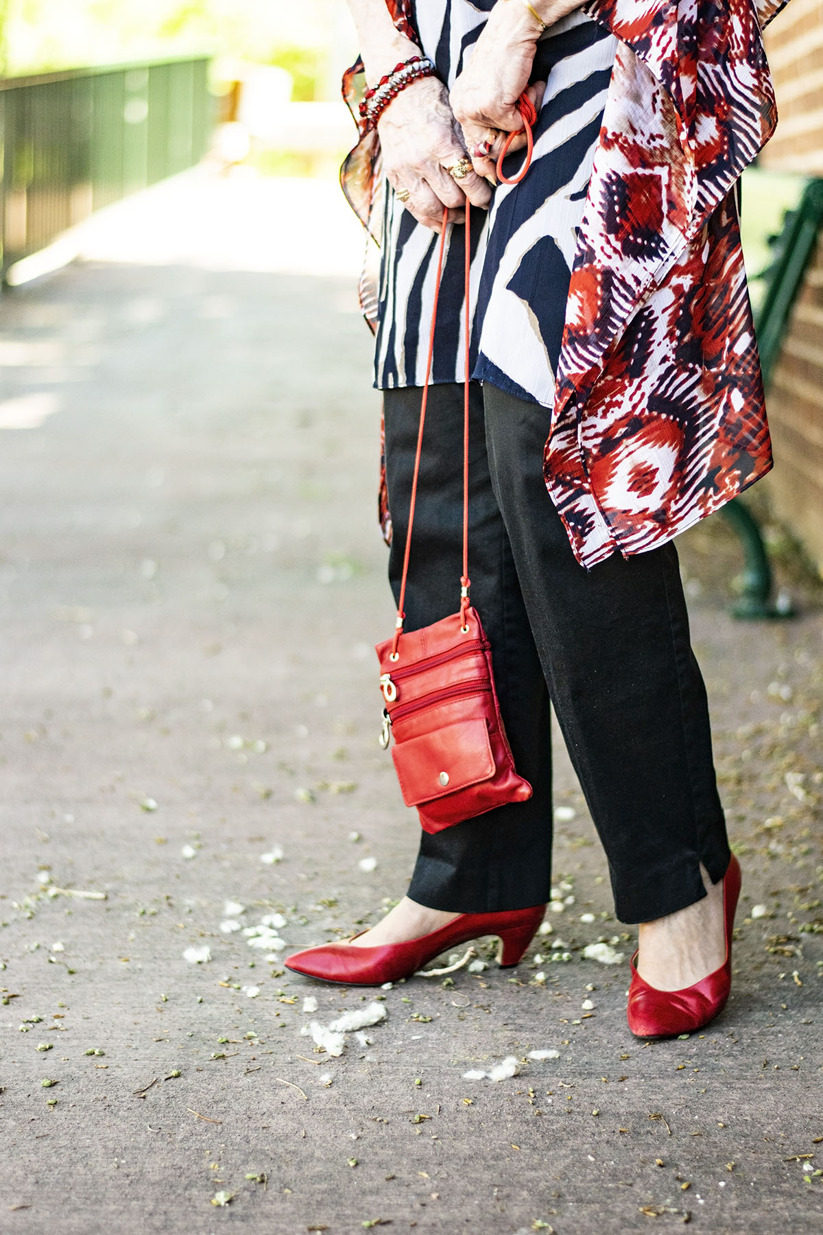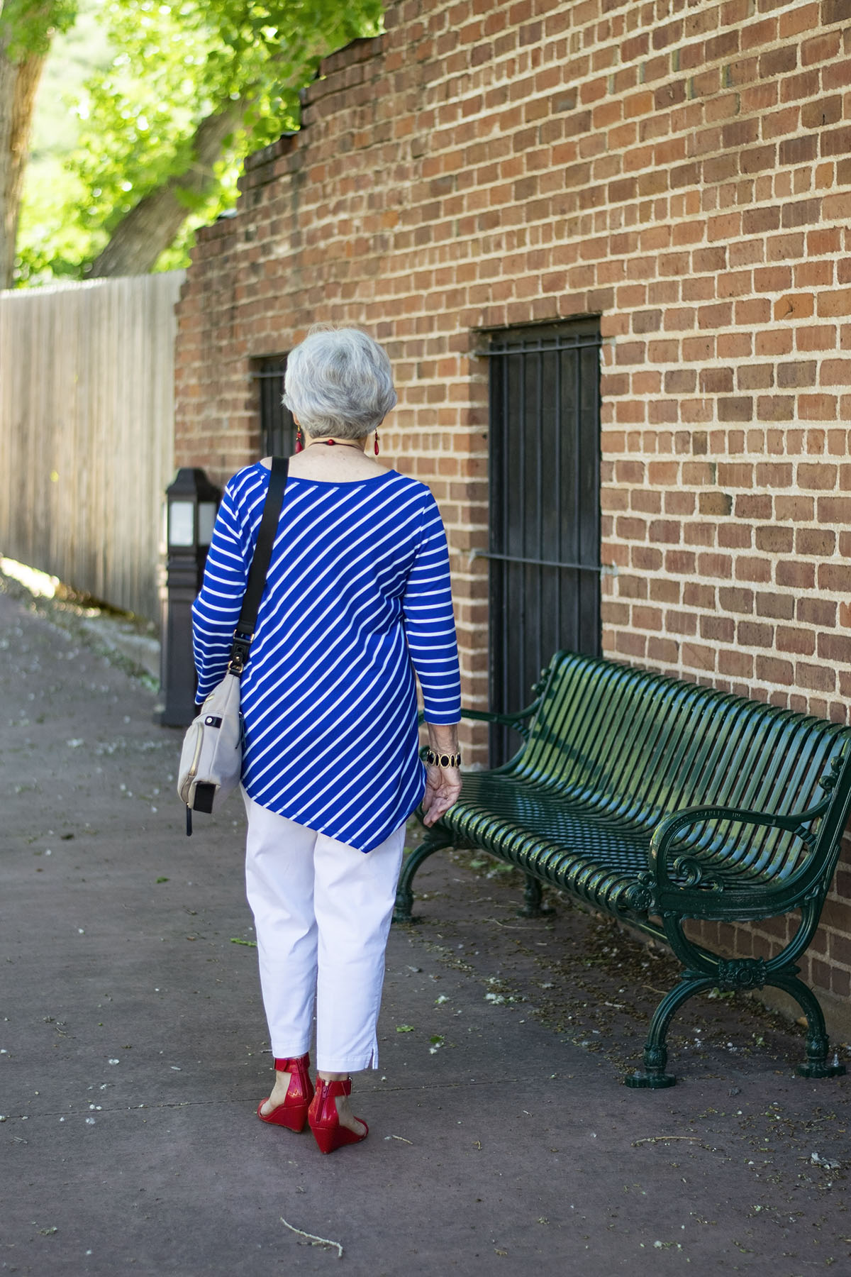 When Nancy did wear this tunic before, she paired it with navy shoes. Of course, I love the pop of red with this outfit, but there are many other options. If you prefer to match your shoes to your pants, then white shoes are making a comeback. If you don’t have white, then nude shoes are always a perfect neutral.
