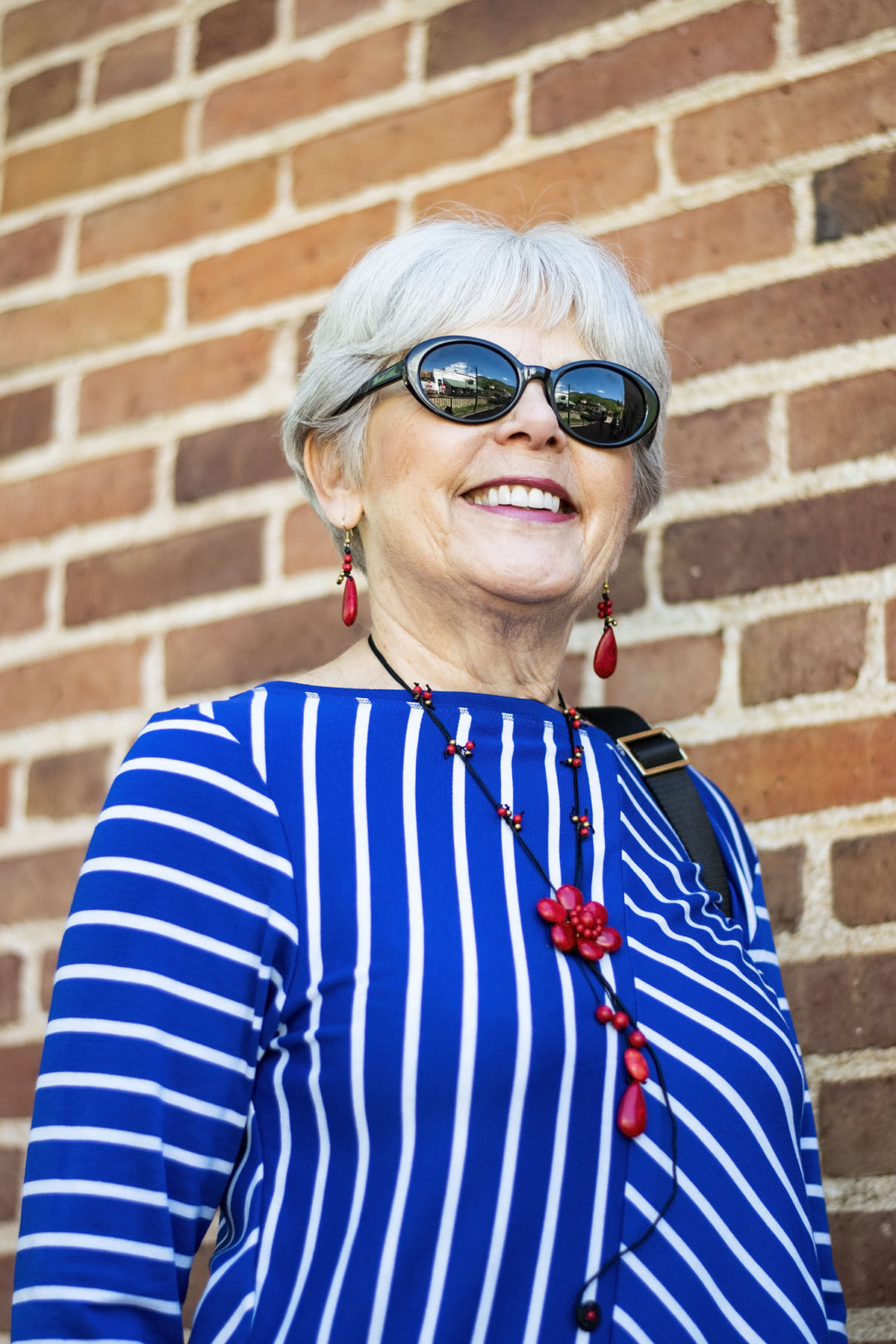 Nancy tells me that she usually wears this matching red necklace and earrings with a red outfit. However, today she decided to step out of her normal box and try them with this blue tunic. I think that’s the best practice for all of us. You never know how versatile pieces are until you experiment with them. And doesn’t the red really pop nicely against the bright blue?