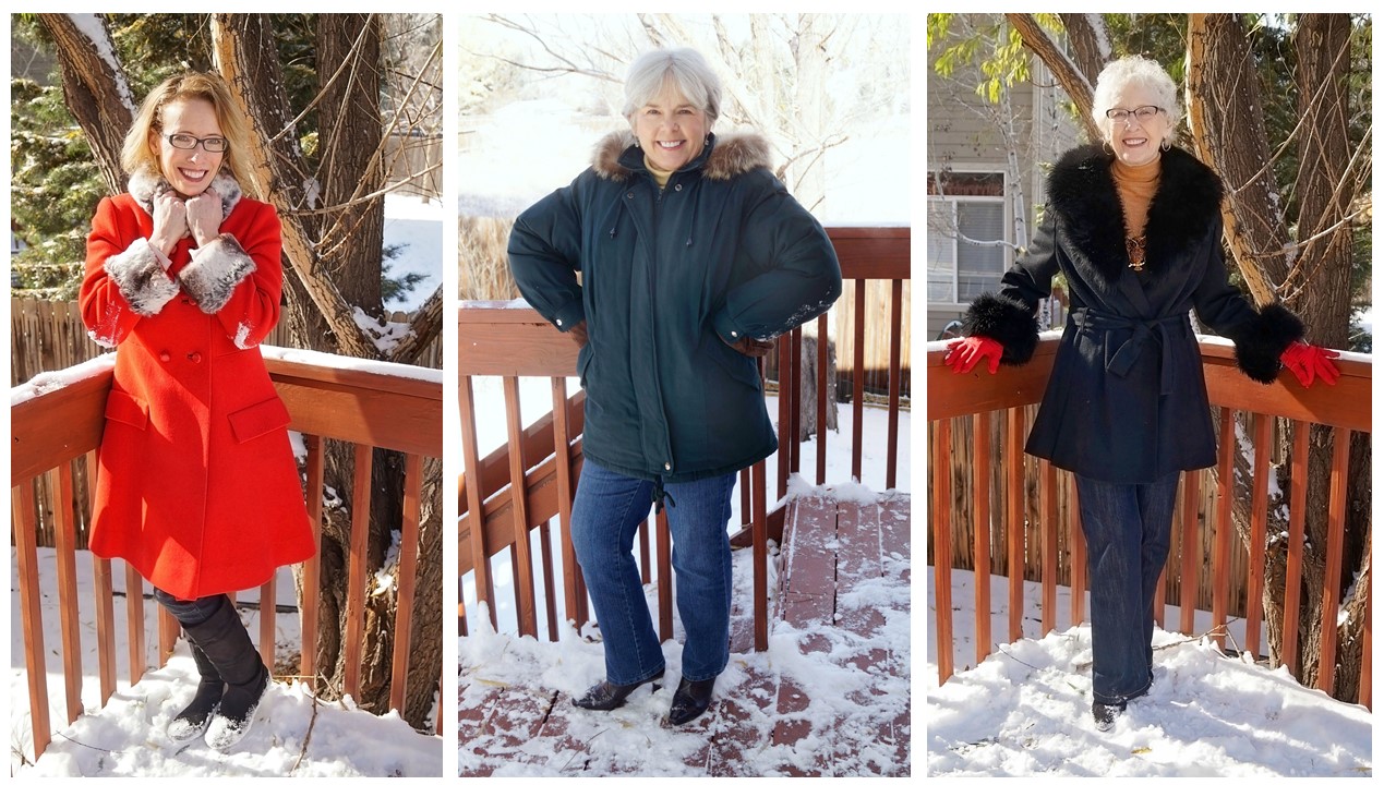 Of course, by this age you have many a plain colored jacket that is thought of as a basic since it goes with everything (or so they say)! And even though I’m a sucker for a exquisite pattern, most of the heavy duty coats are without embellishment. Considering this, a fur collar is an easy way to gussy up the simple overcoat. This is a built in pizzazz if your coat comes with a fur collar, but if not you can add your own with a fur neck scarf wrap. Another great tip to spruce up a stark coat is with a leather belt (see Cold Weather Outerwear 2) or a decorative scarf. If you worry about the scarf getting lost, you can safety pin one area of it to the coat for reassurance. More examples of winter coats on Cold Weather Outerwear 1.