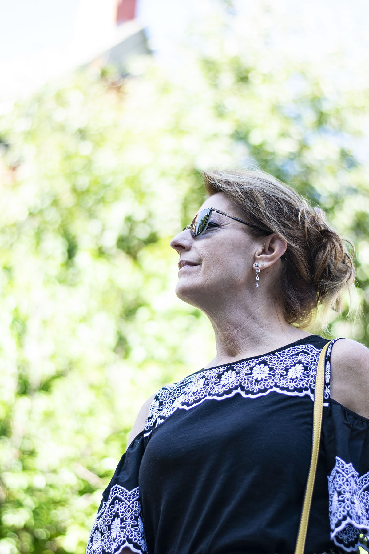 Stacy just bought this top recently. Most of her tops that were already in her closet were for work to pair under a suit jacket. Therefore, she thought the lace and open shoulders were perfect for this theme. And she included the belt to create more of a fitted silhouette.