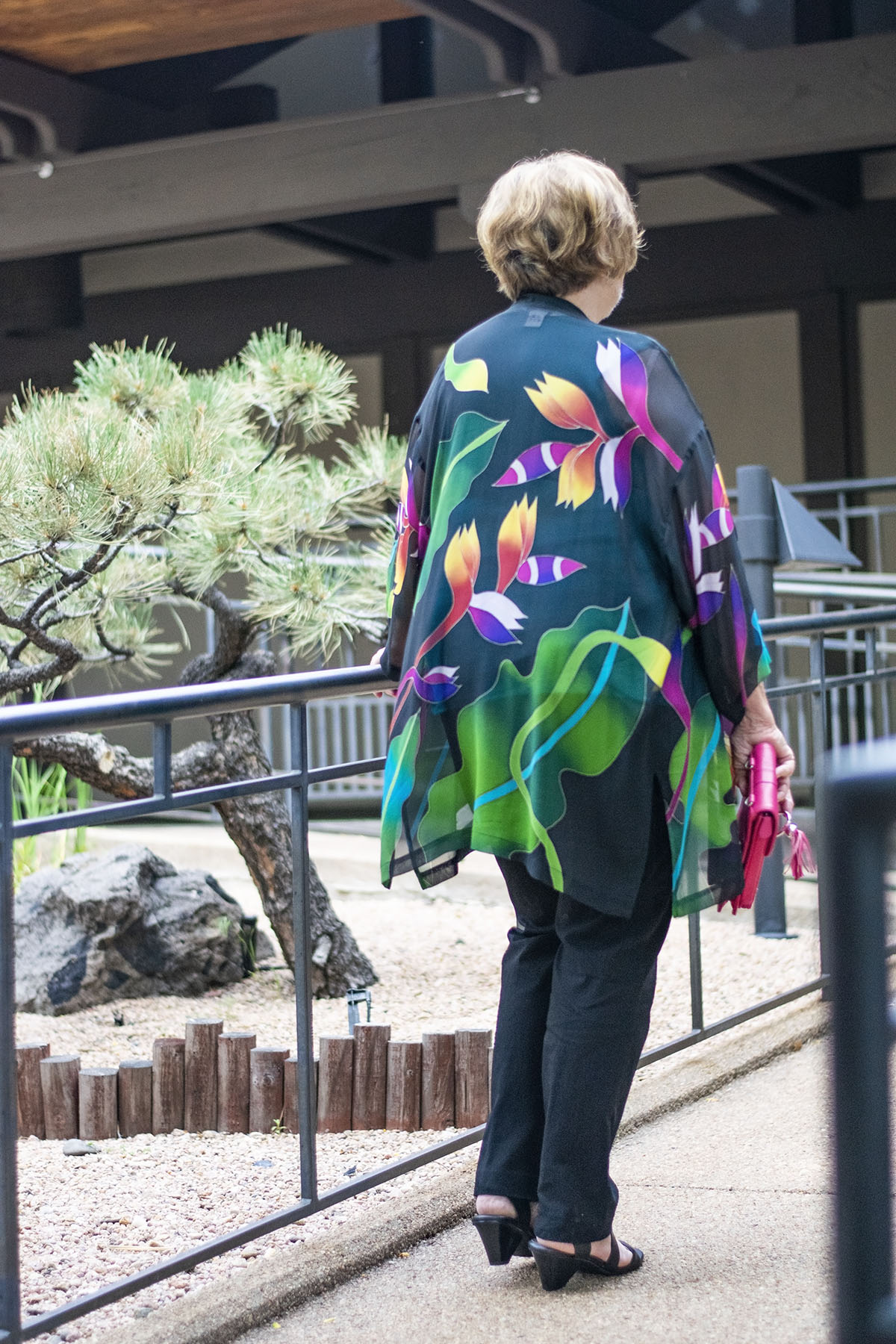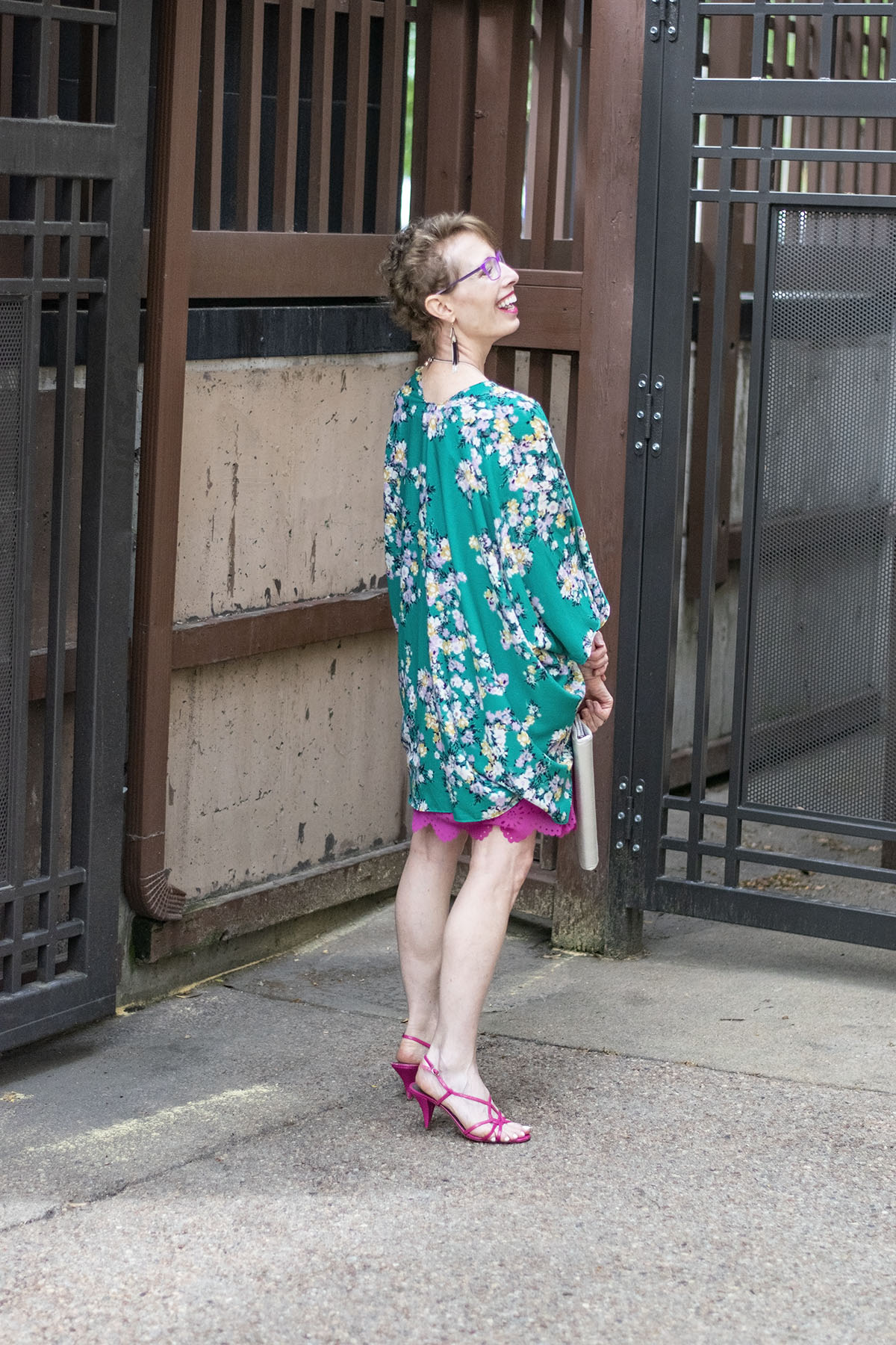 If you ever struggle with the fact that your topper tends to slip off your shoulders, then one trick of how to wear a kimono is to attach it somehow. My mom used the trick of using a flower pin to keep it in place. In fact, Nancy used this same trick recently only with a more subtle pin that you really don’t notice because it blends in with her necklace.