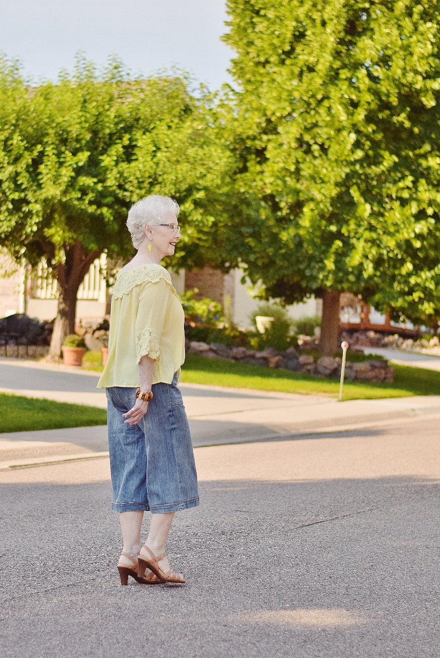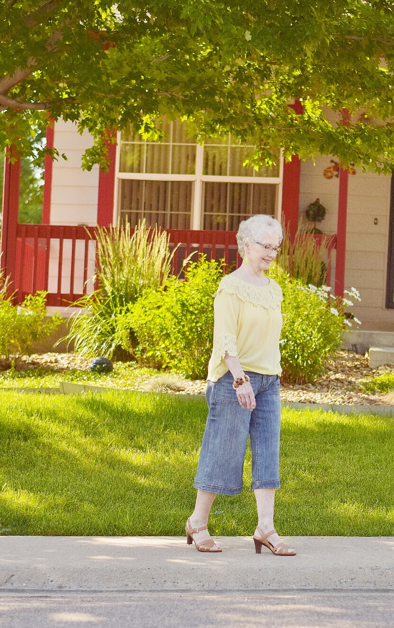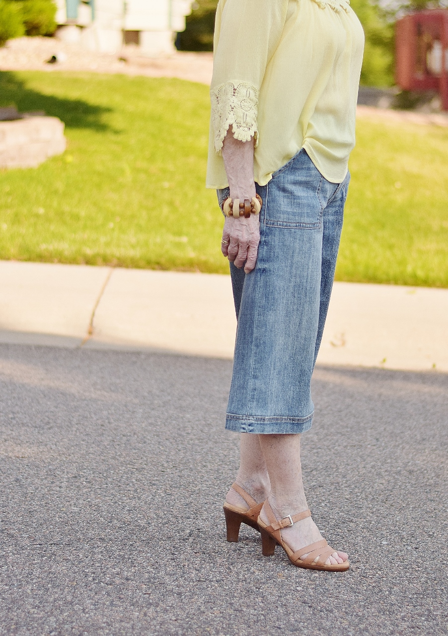It’s a little funny, how the three of us are showing a variation of lengths of pants in this post! I’m wearing shorts, Nancy has on these capris that end right above her knee, and my mom has on culottes that are more of a midi length!