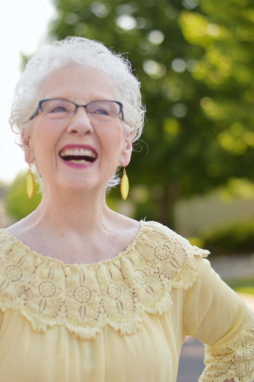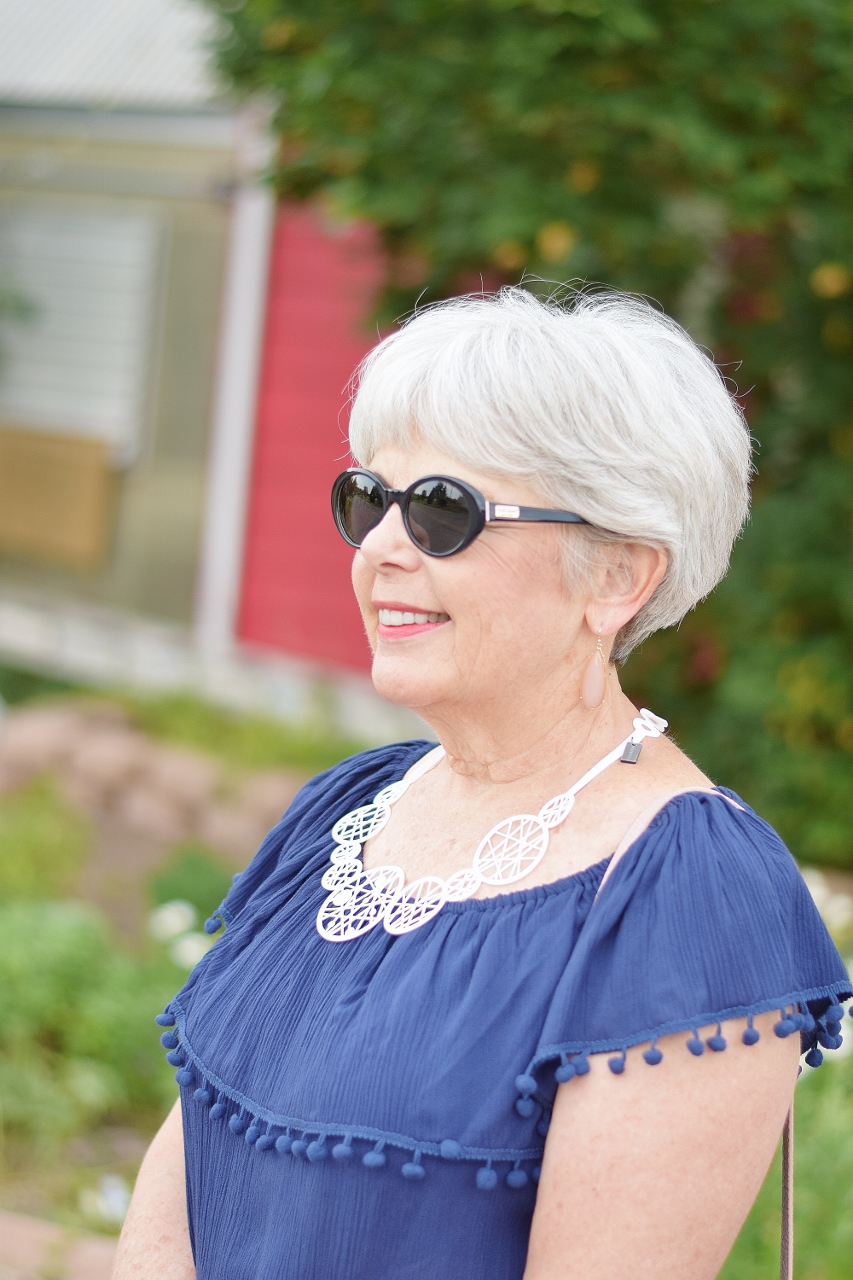 Since Nancy was wearing white capris pants, we thought we’d accessorize with her white Coruu silicone necklace. The last time she wore it, it was against her skin, and didn’t show up as much.