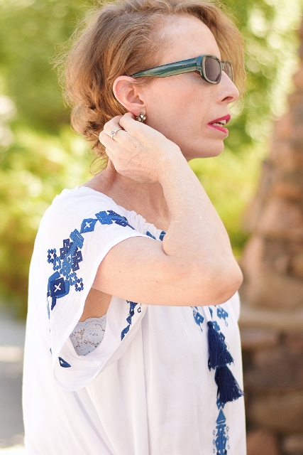 Therefore I pulled out my new embroidered top from Chicos, that I purchased when we traveled out to LA to meet up with women of the Fierce 50! You may ask why would you want to go to a chain clothing store when you are traveling? But there are many times that I have found going to different geographic locations provide different selections from your hometown store!!